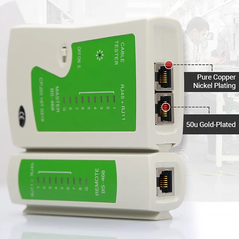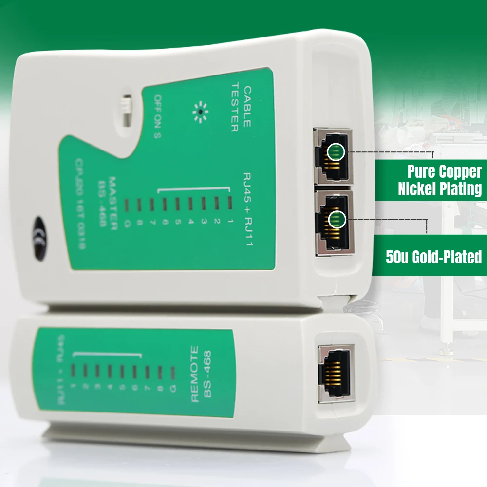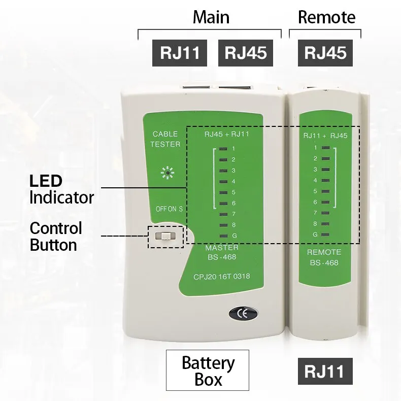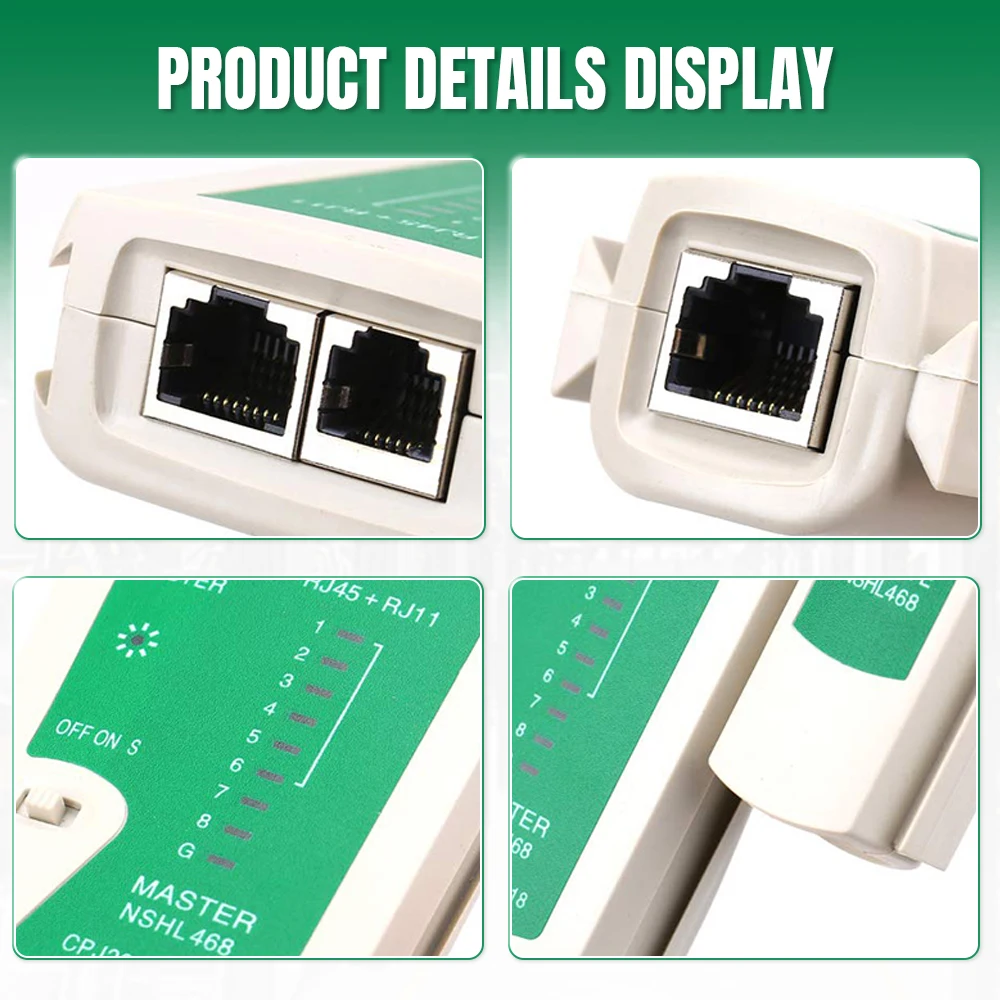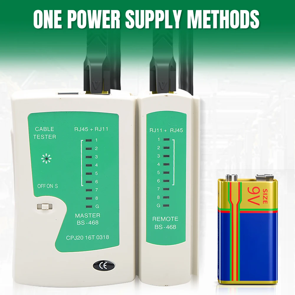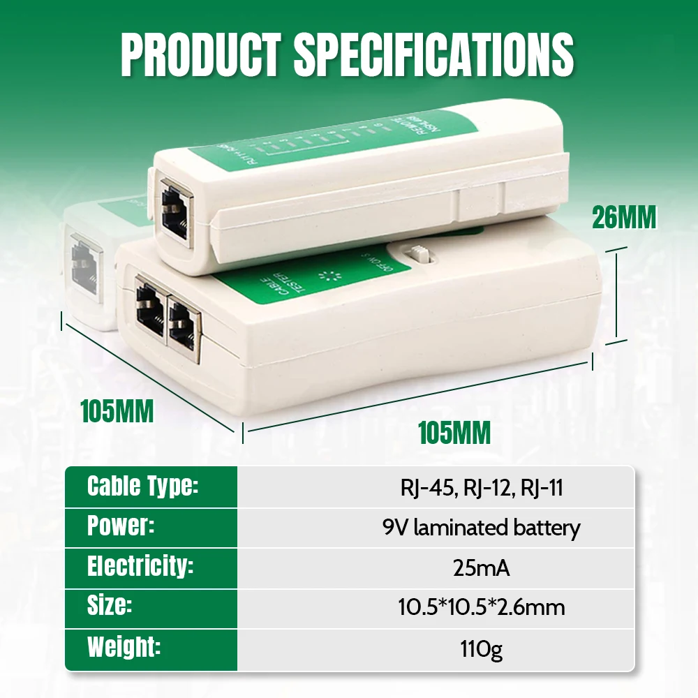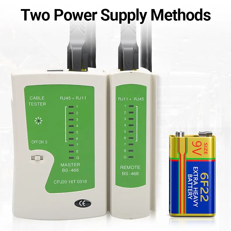 Prueba cables RJ45, cables telefónicos RJ11 y cables de red.Requiere una batería de 9 voltios (no incluida)
