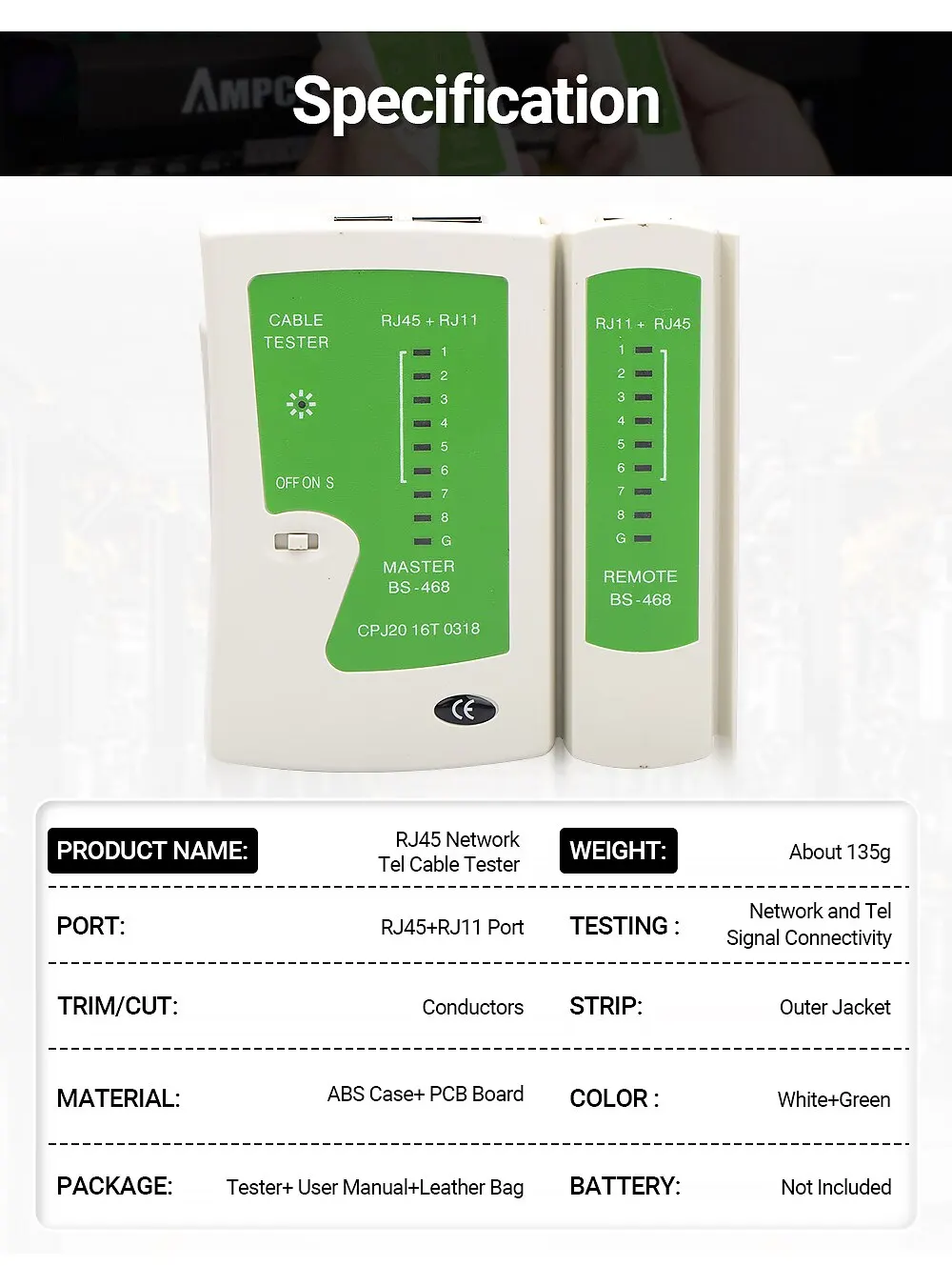 Instalación en el hogar: el probador es adecuado para cables de red Cat7, Cat6 y Cat5 RJ45 y cables telefónicos RJ11.Ampliamente utilizado para configurar instalaciones de redes domésticas y fabricar cables de conexión.Si usted es un profesional como un electricista, un técnico de TI o un aficionado, puede usarlo para tomas Ethernet, cámaras de seguridad u otros dispositivos.