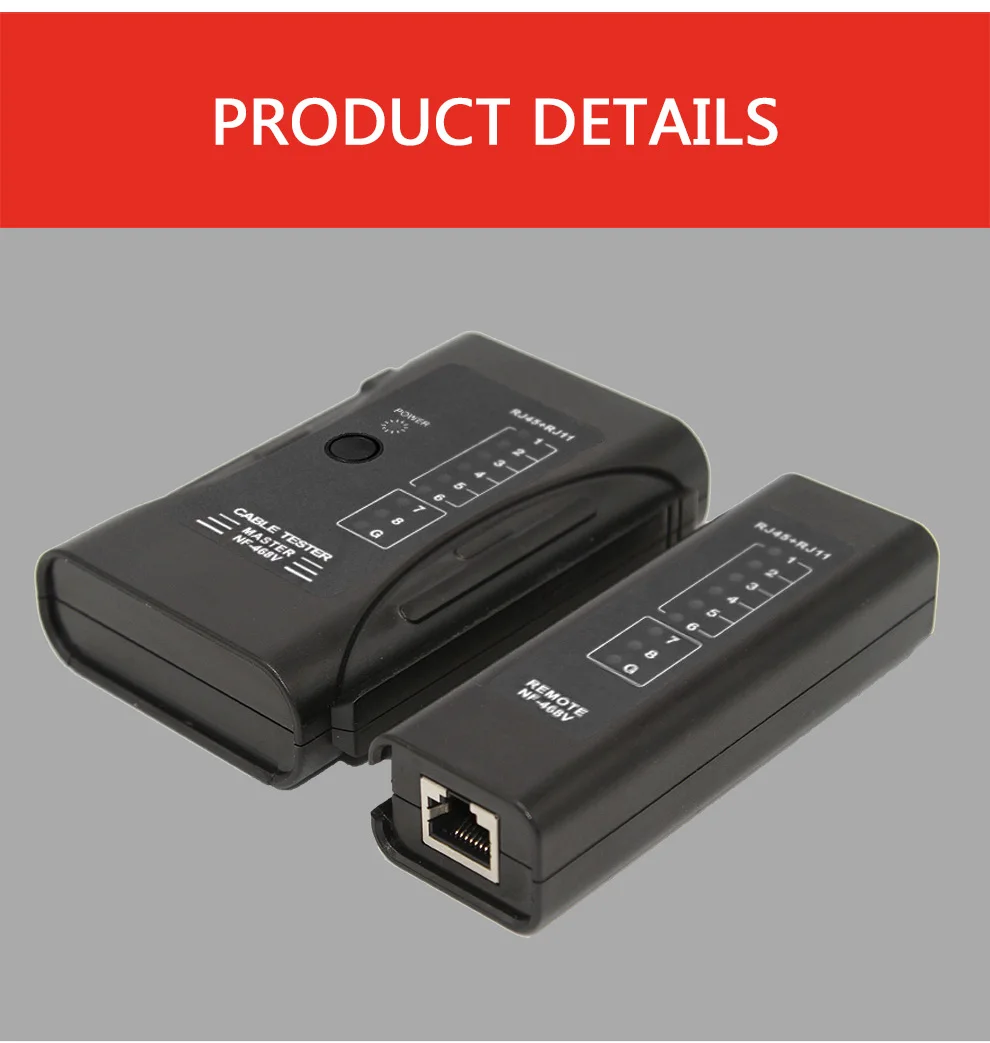 1. los cables correspondientes de doble torsión Pruebe 1, 2, 3, 4, 5, 6, 7, 8 y tierra. Capaz de juzgar la conexión incorrecta, el cortocircuito y el circuito abierto. Probador de cables para Rj11, Rj12, Rj45, CAT 5E, CAT 54.It puede aclarar fácilmente el cable, la continuidad, abrir y short5.Verificación de la continuidad del cable, par de cables abiertos, cortos y cruzados hasta 1000Ft con kit remoto