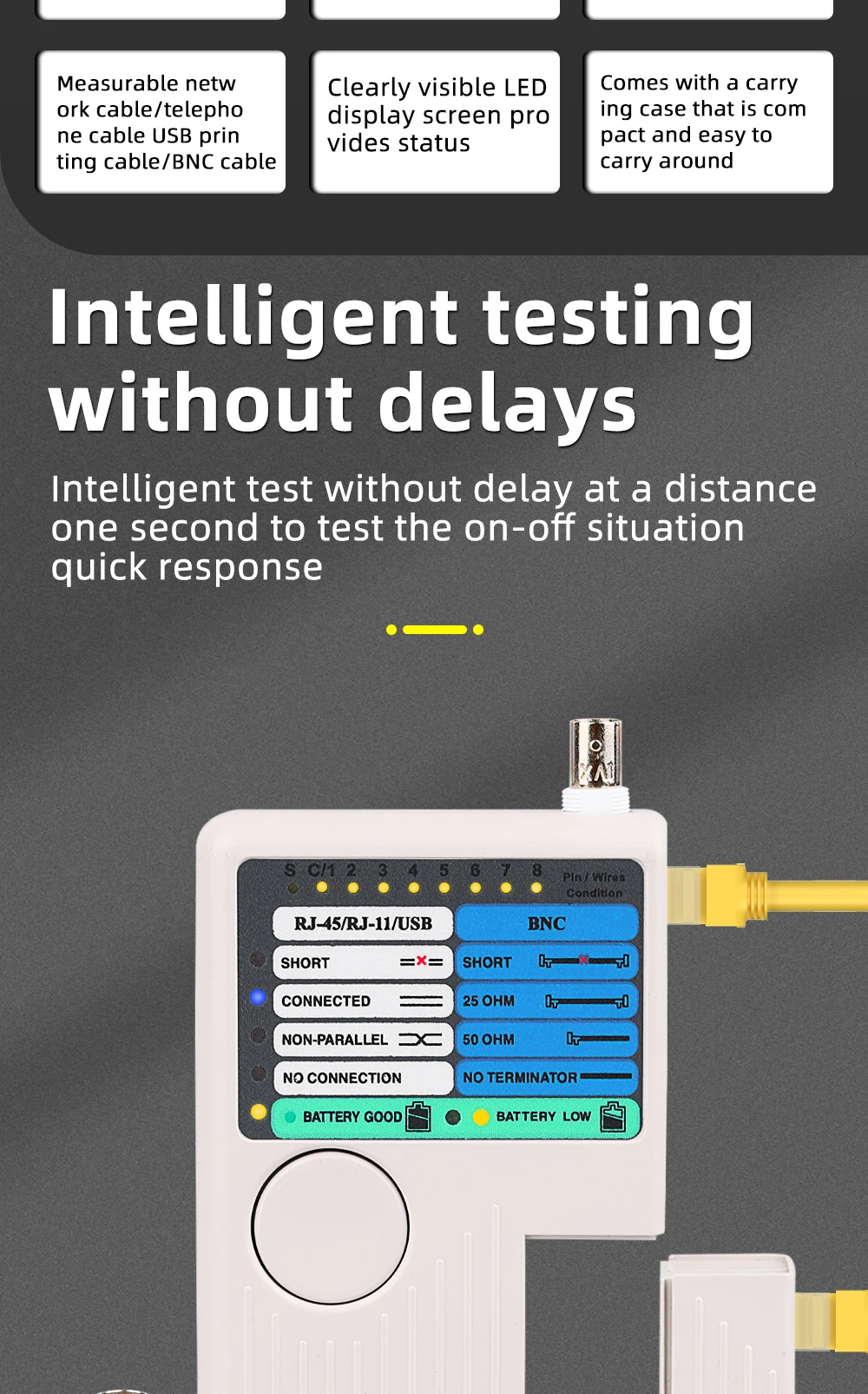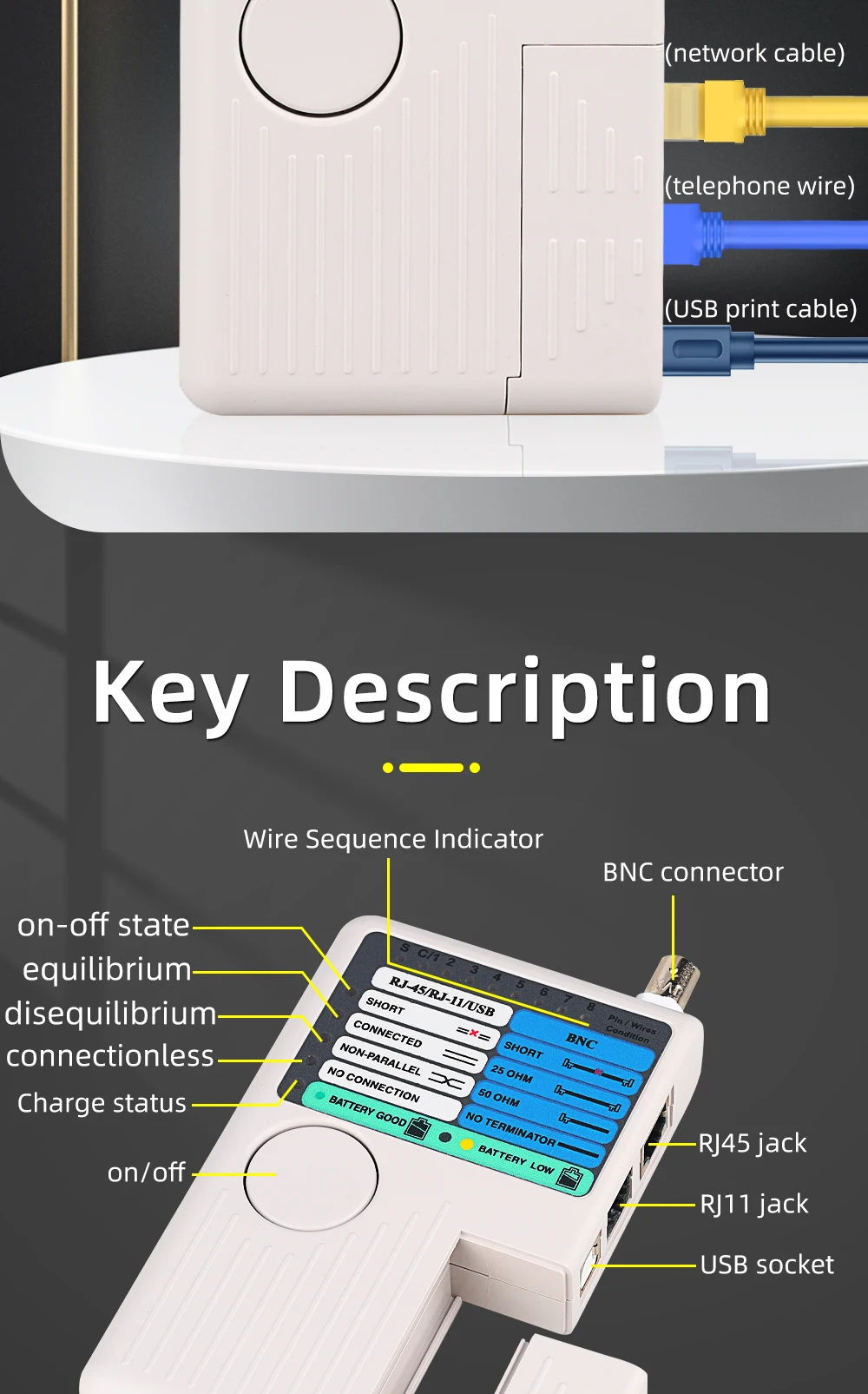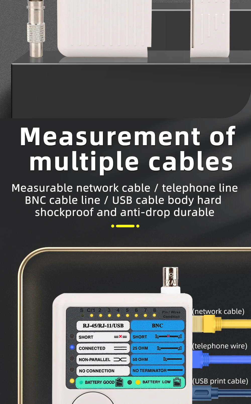 1. Rango de prueba: puede probar cable de red/cable telefónico, cable de impresión USB/línea de cable BNC