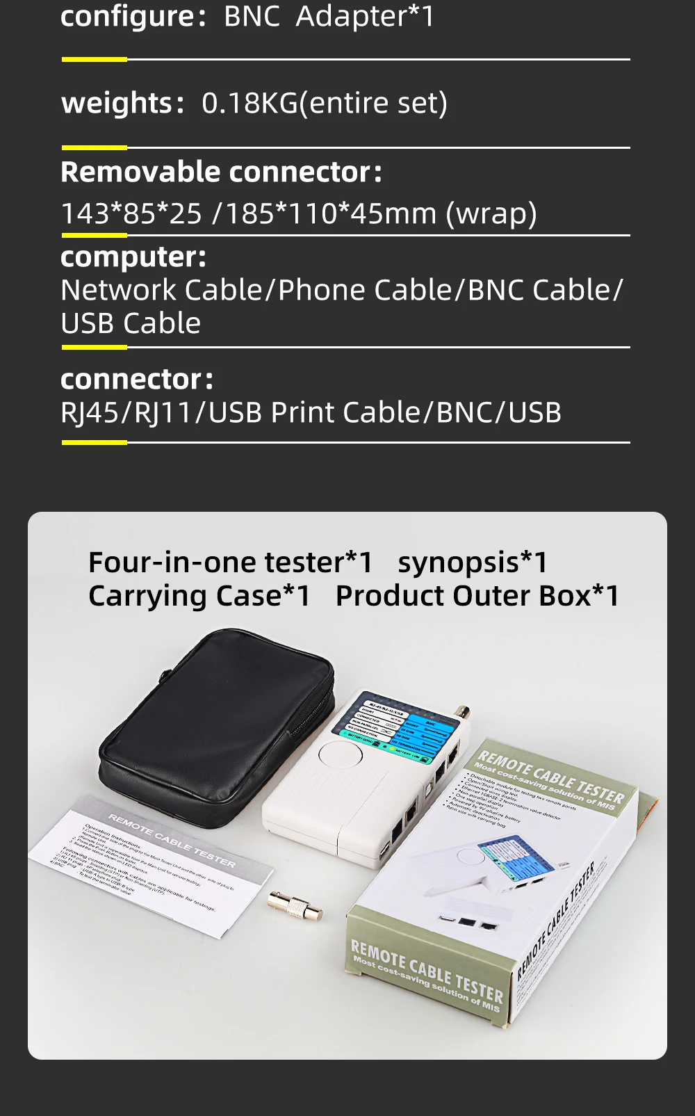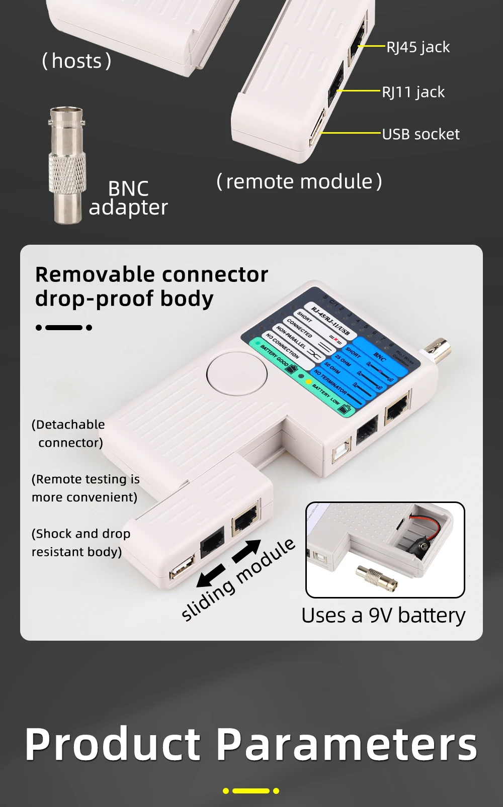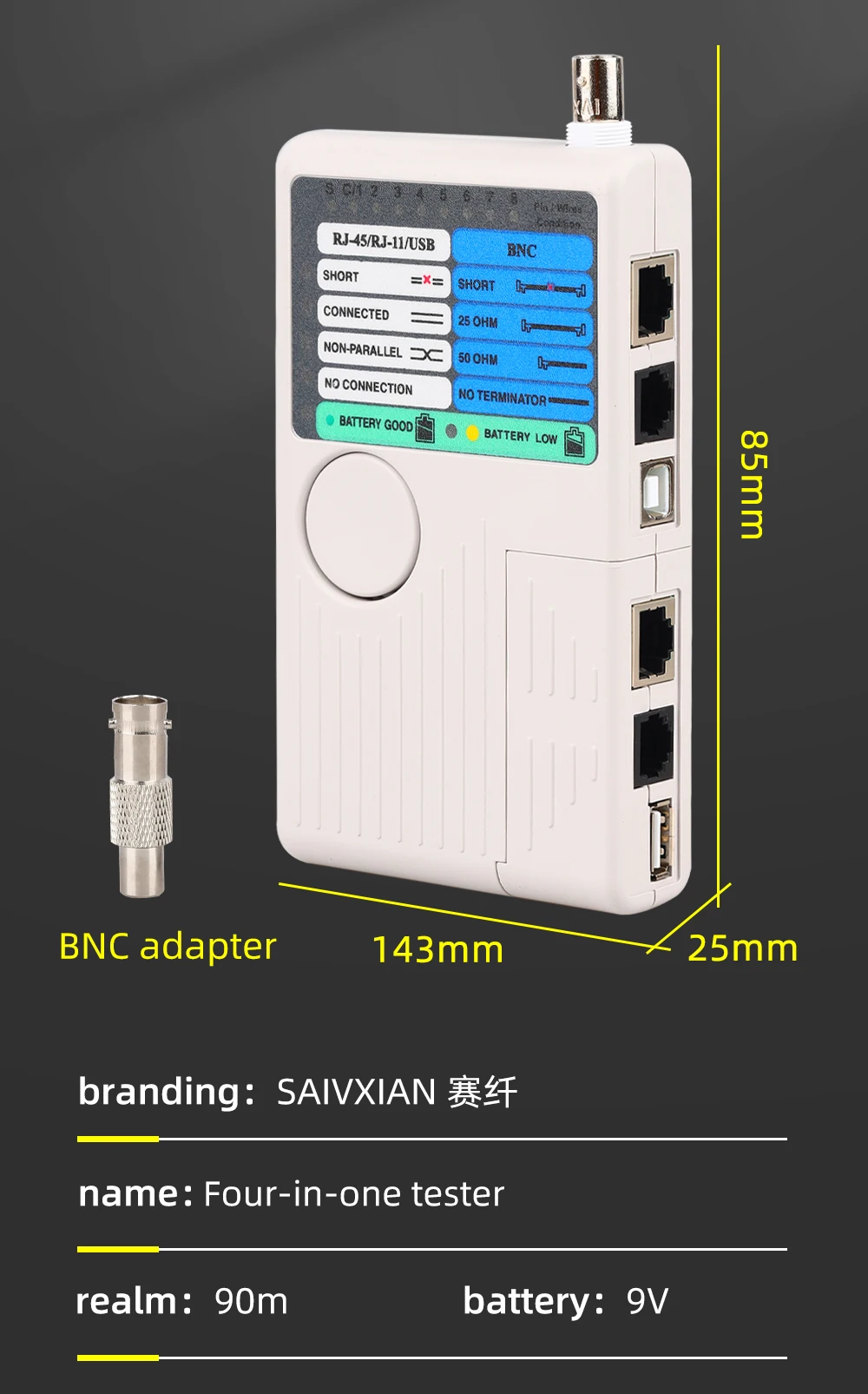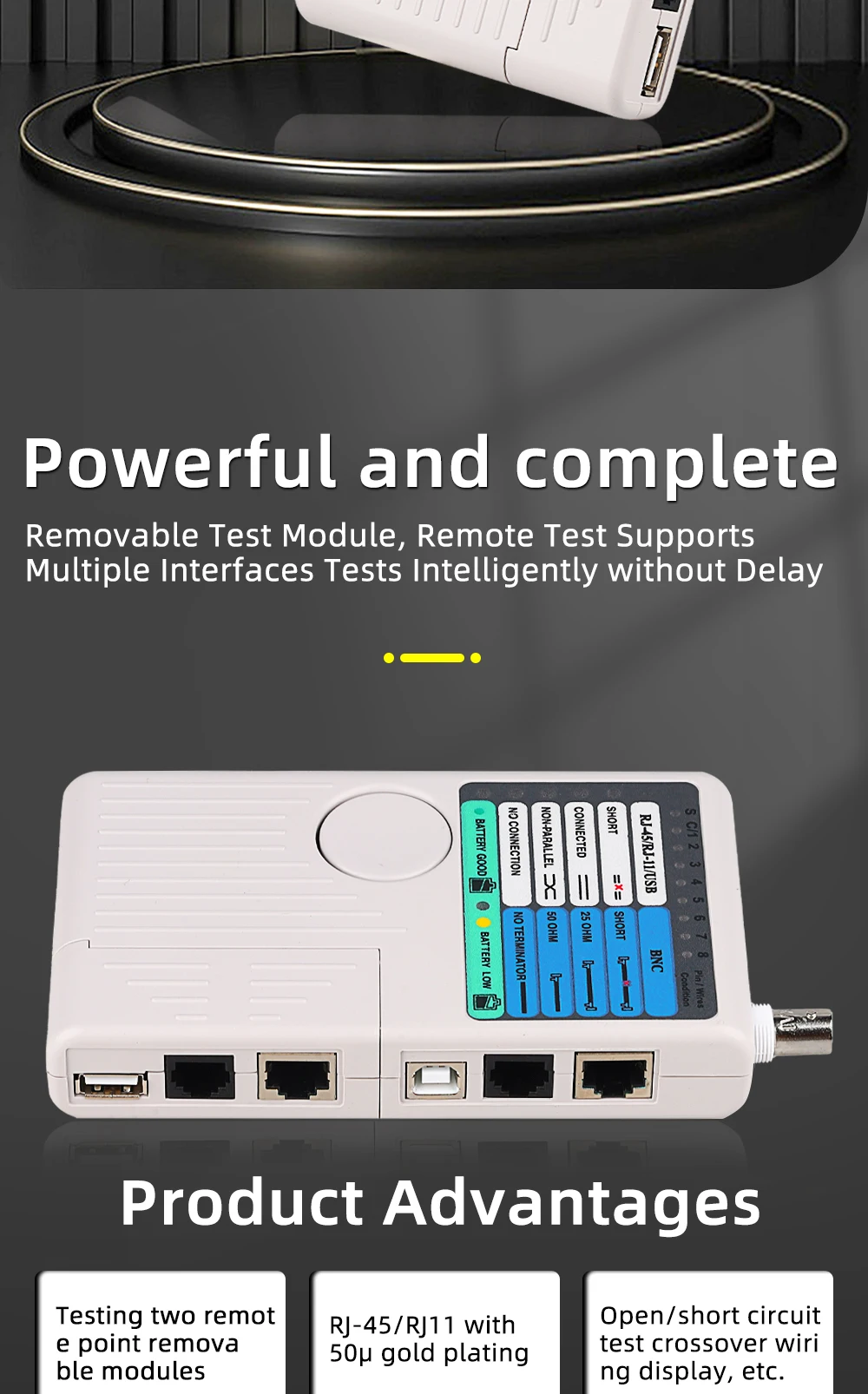 1. Rango de prueba: puede probar cable de red/cable telefónico, cable de impresión USB/línea de cable BNC