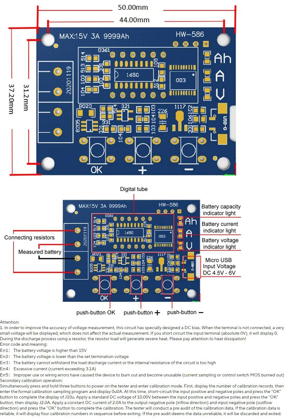 Rango máximo de capacidad de la batería: 9999Ah (1Ah=1000mAh). Los valores más grandes se cambian mediante cambio de punto decimal, y cuando está por debajo de 10 Ah, se muestra como X XXX. Si alcanza 10 Ah o más, se mostrará como XX, etc.