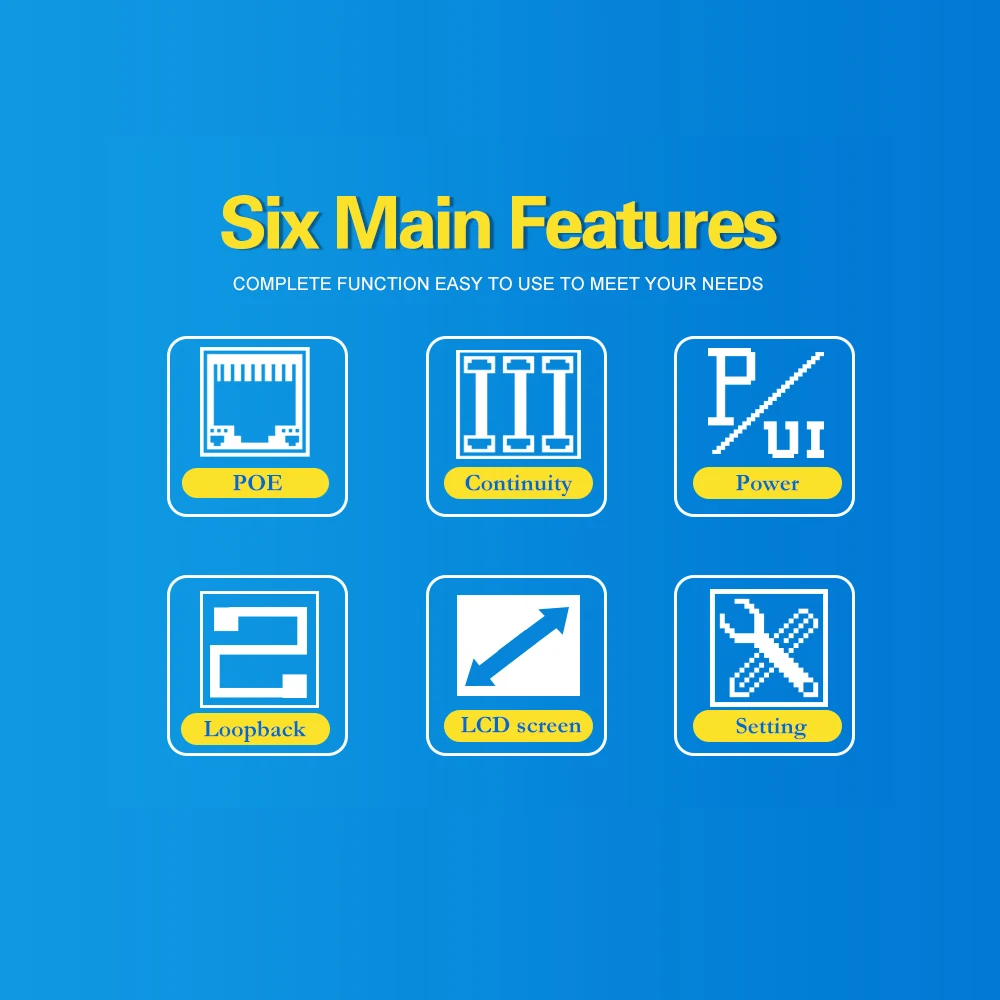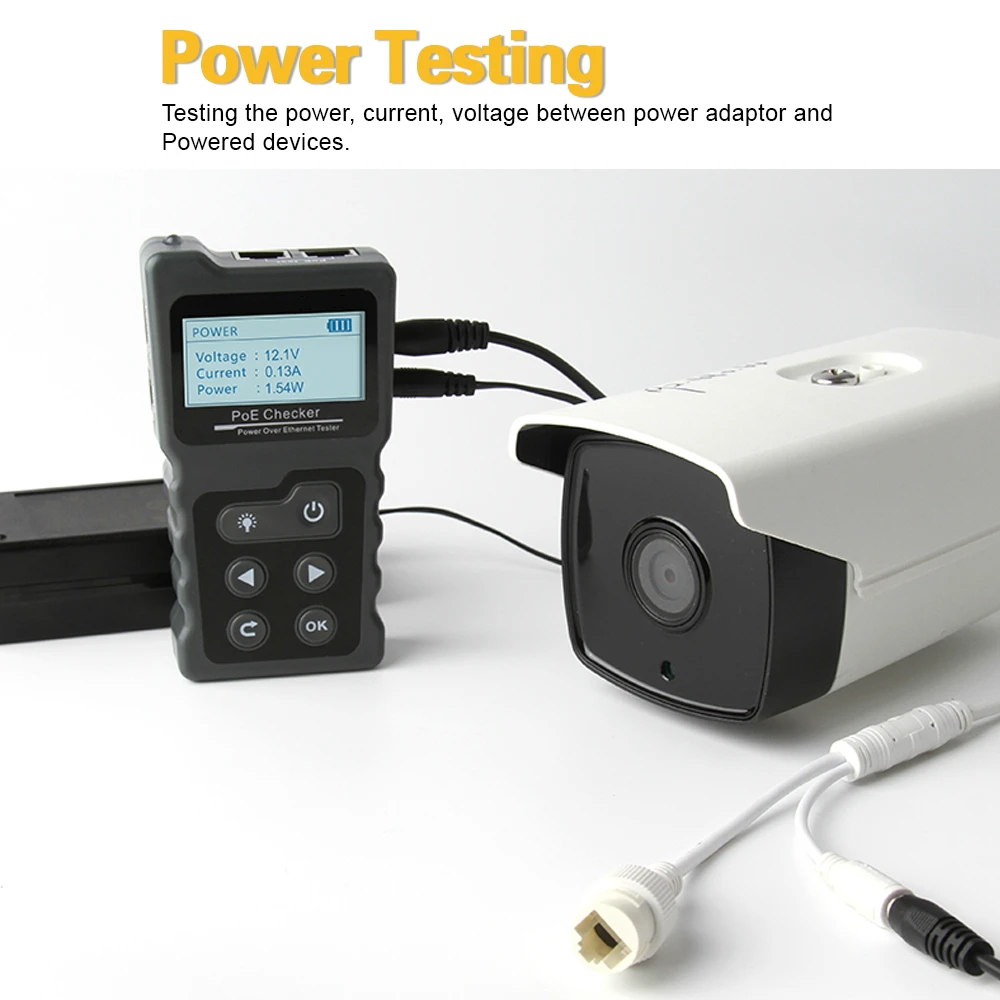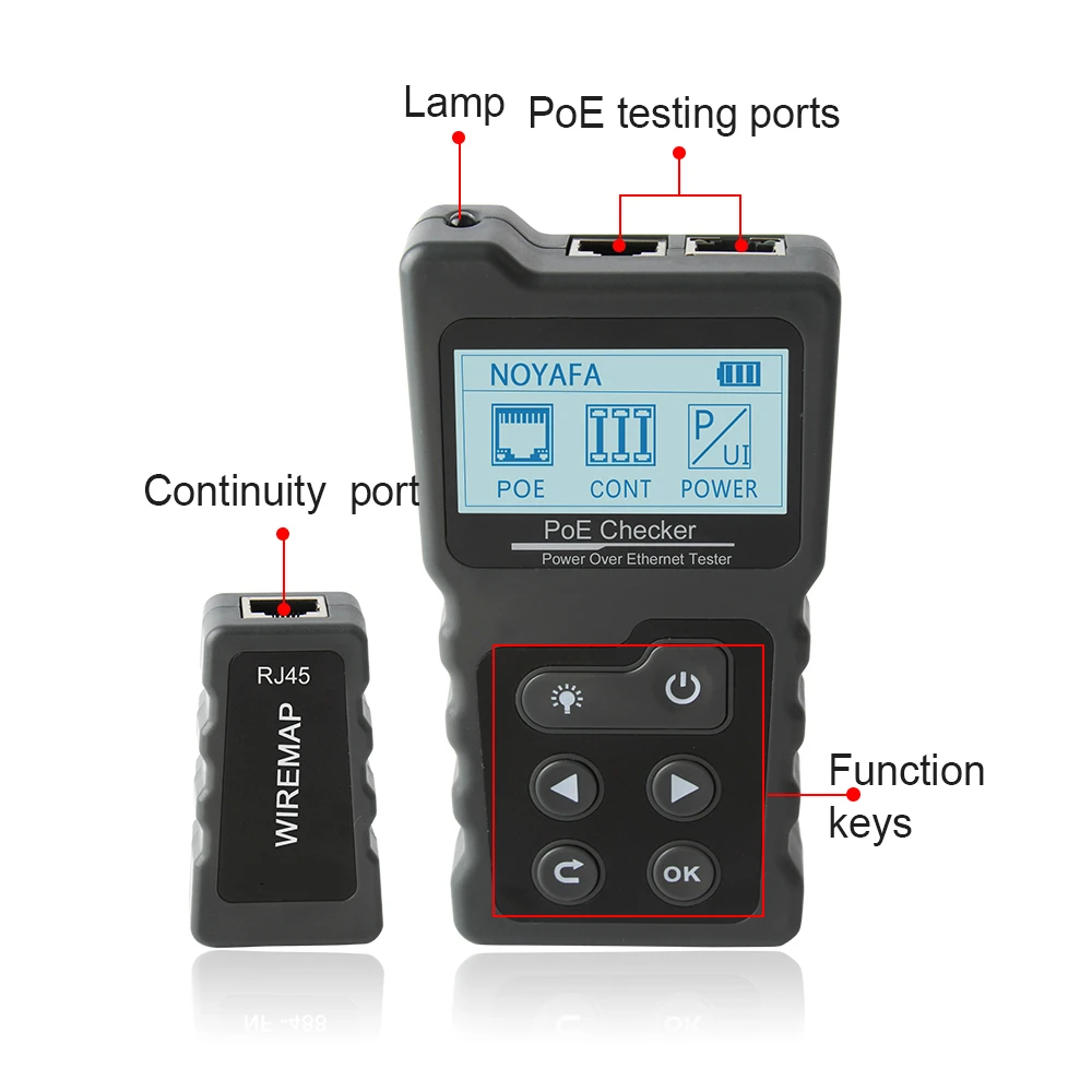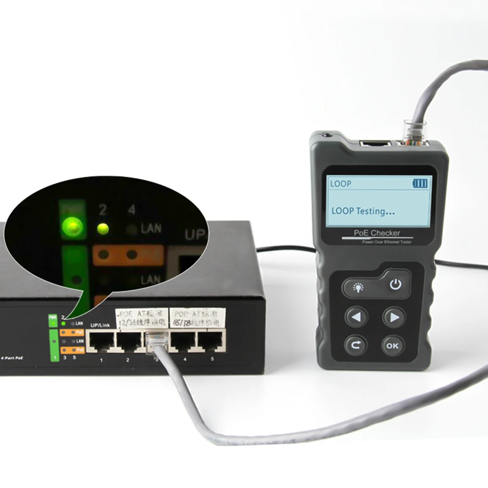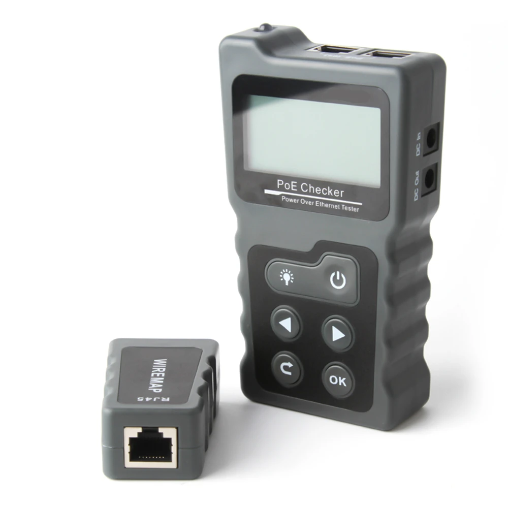 El comprobador PoE se compone de dos partes: un emisor y un control remoto. Tiene funciones como detección de equipos PoE estándar y no estándar, prueba de alimentación PoE en línea, prueba de continuidad de cable de red, prueba de potencia CC, prueba de bucle de conmutación y otras funciones. Por lo tanto, es perfecto para monitoreo de seguridad, cables de comunicación, cableado integrado y otros sistemas de corriente débil.