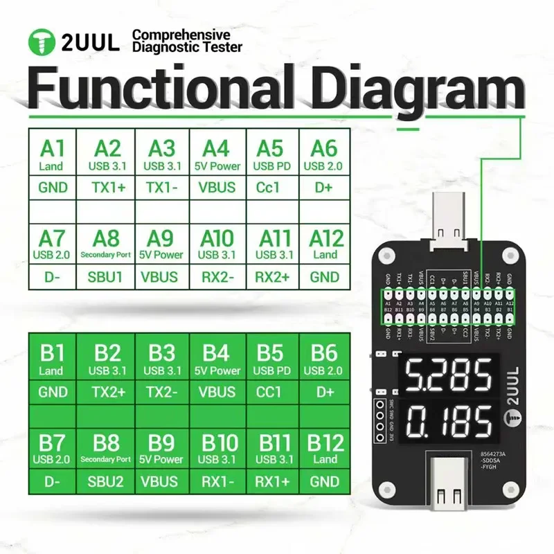 Probador de diagnóstico integral de puerto tipo C 2UUL PW32 con detección de carga en tiempo Real para reparación de teléfonos móviles, probador rápido