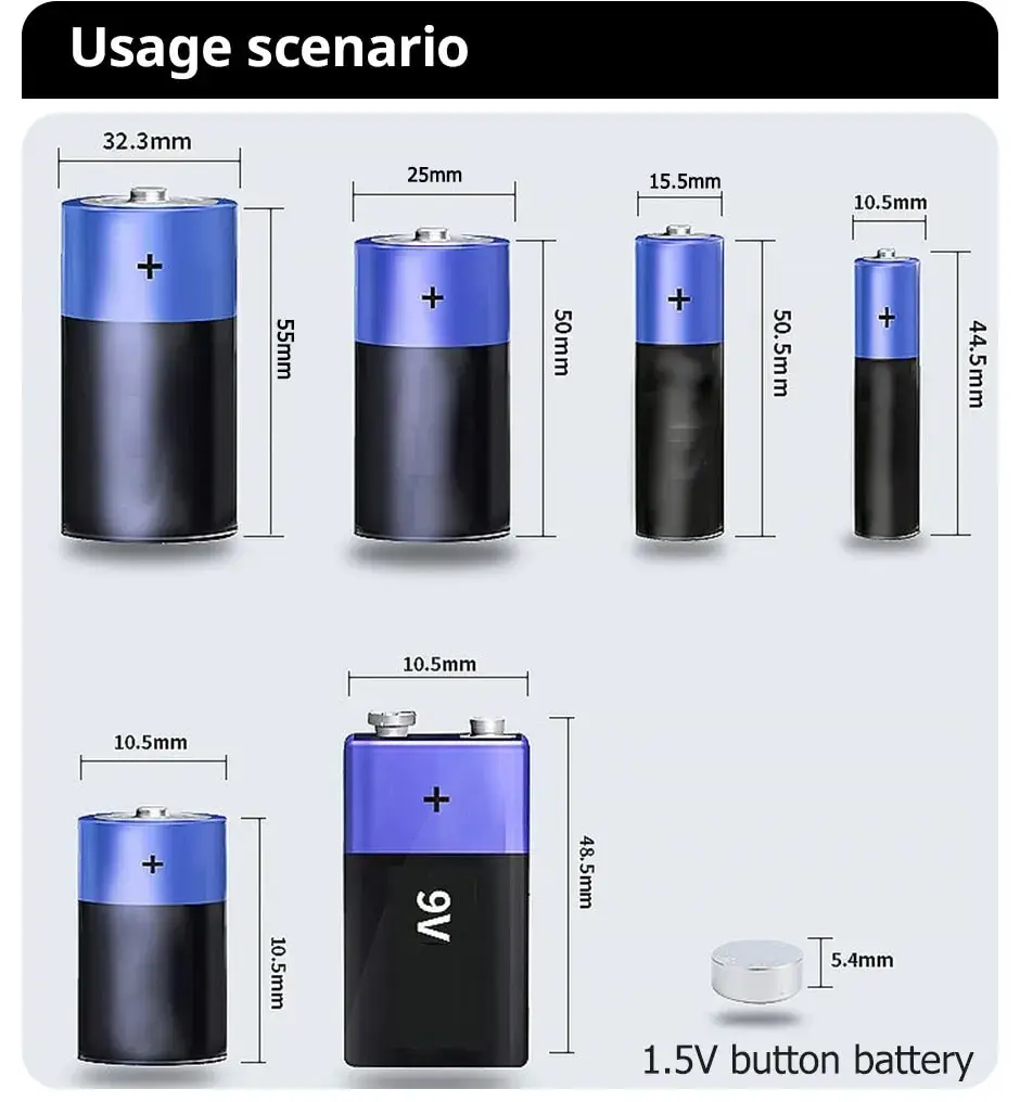Pruebe las baterías del mismo tamaño: C, AA, AAA, D, N, 9V 6F22 y SR44 y LR44, batería de la pila del botón 1,55 V.