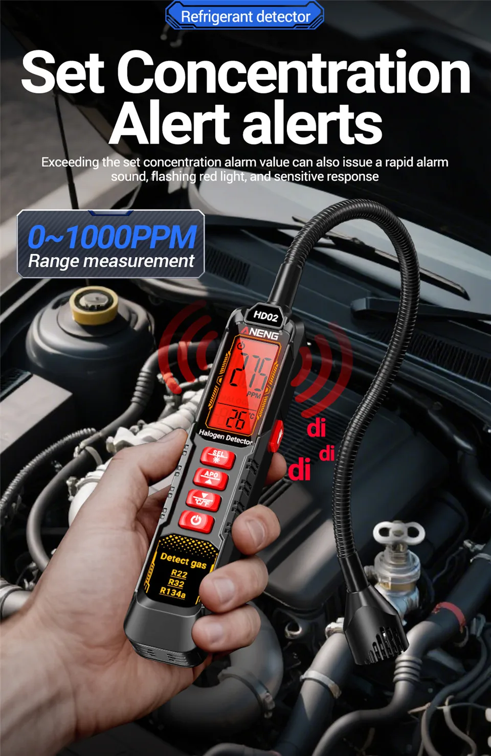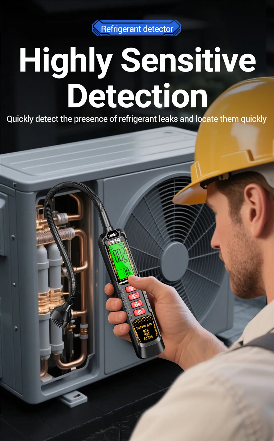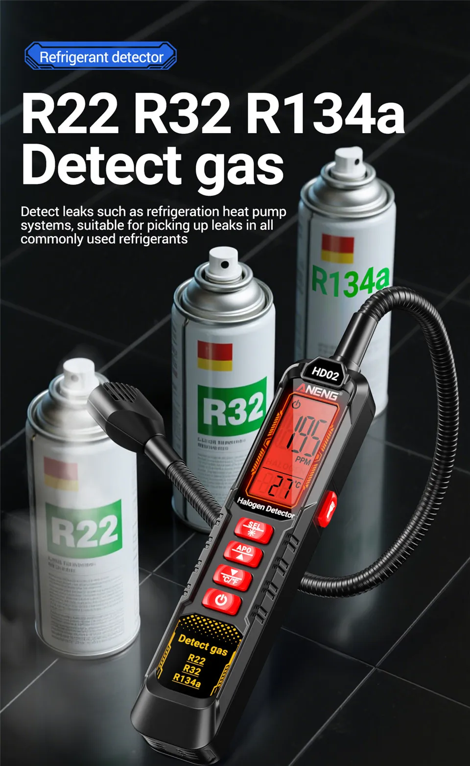 ANENG Detector de refrigerante digital 0 ~ 1000 ppm recargable detecta R22/R32/R134a HD02 Diversos refrigerantes de la industria profesional Herramientas de prueba de detector de gas halógeno para refrigerantes