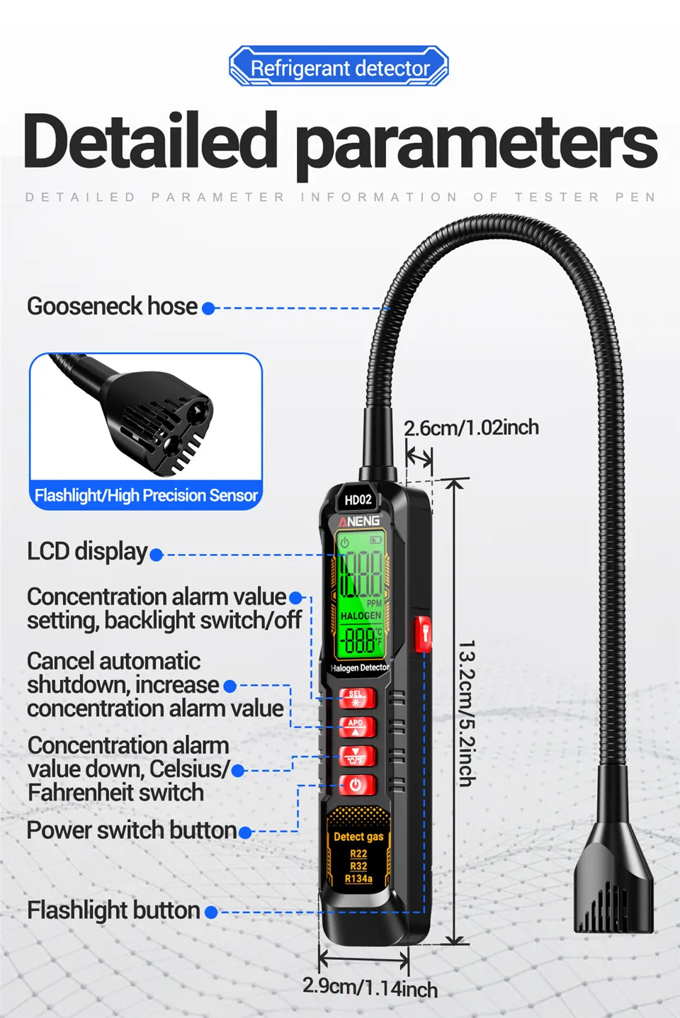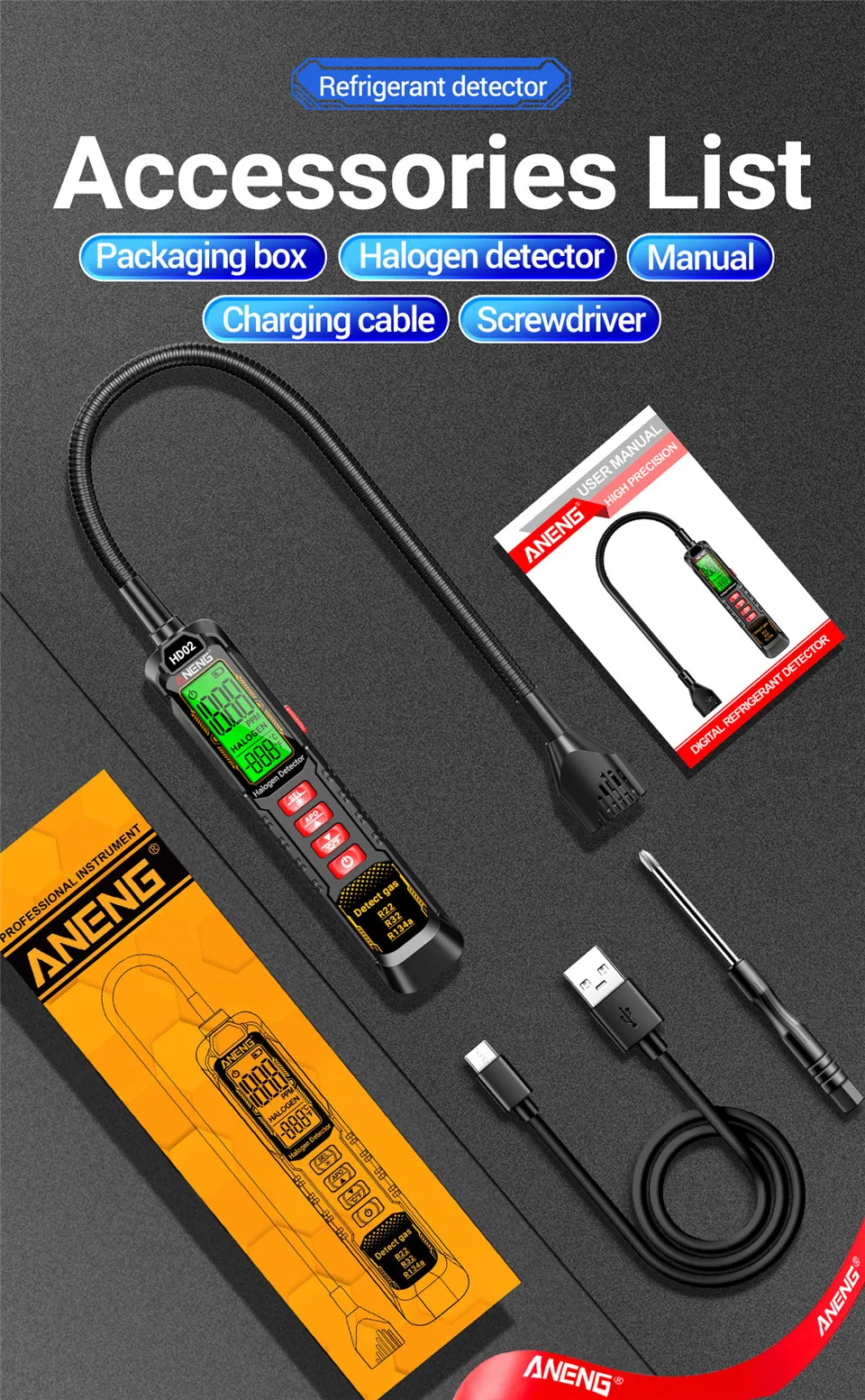 Detector de fugas halógeno, ANENG HD02, reniflador de gas refrigerante, probador de fugas tipo C, 360° sonda de cuello de cisne, medidor de 0-1000 PPM, herramienta de reparación de HVAC, inspección de CA para automóviles, detector R134a,