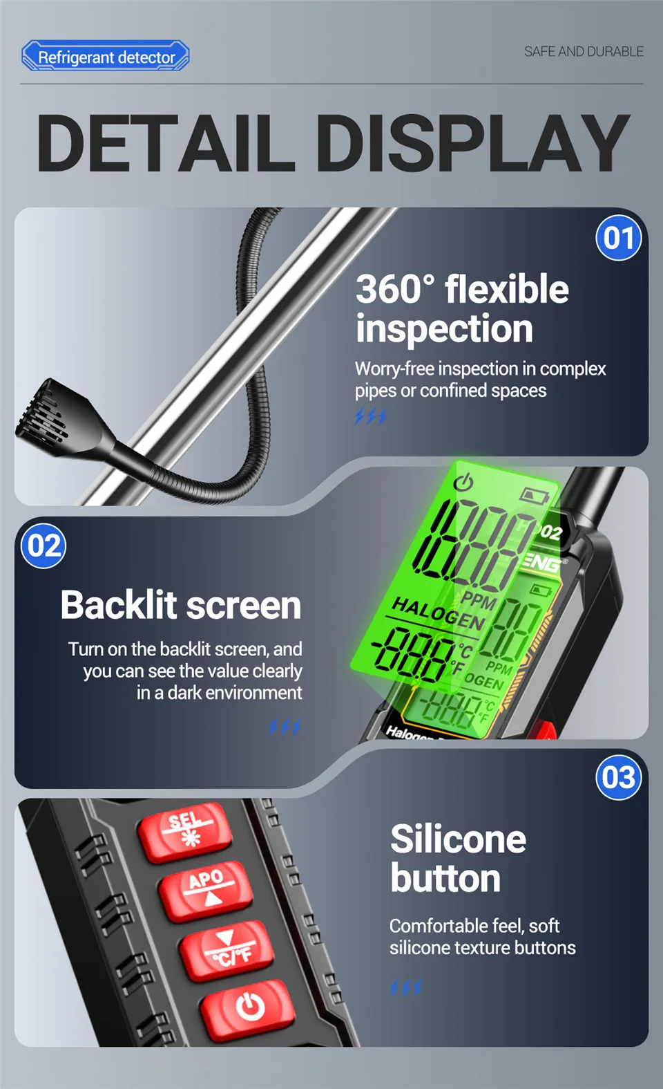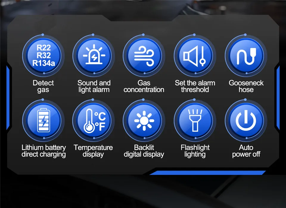 alarma de luz sonora, buscador de fugas en linterna, alerta de concentración ajustable, pantalla digital retroiluminada, refrigeración industrial, mantenimiento de CA doméstico