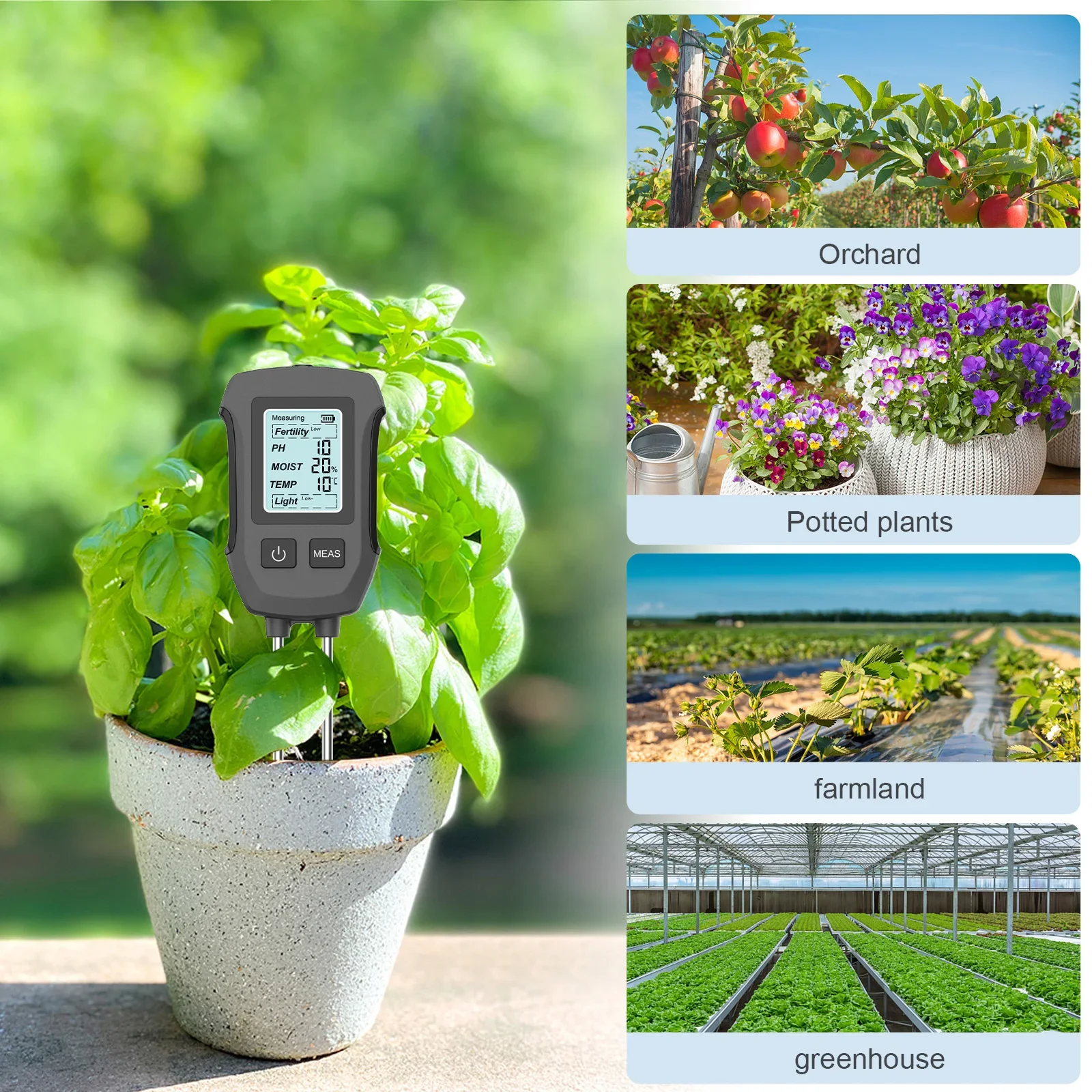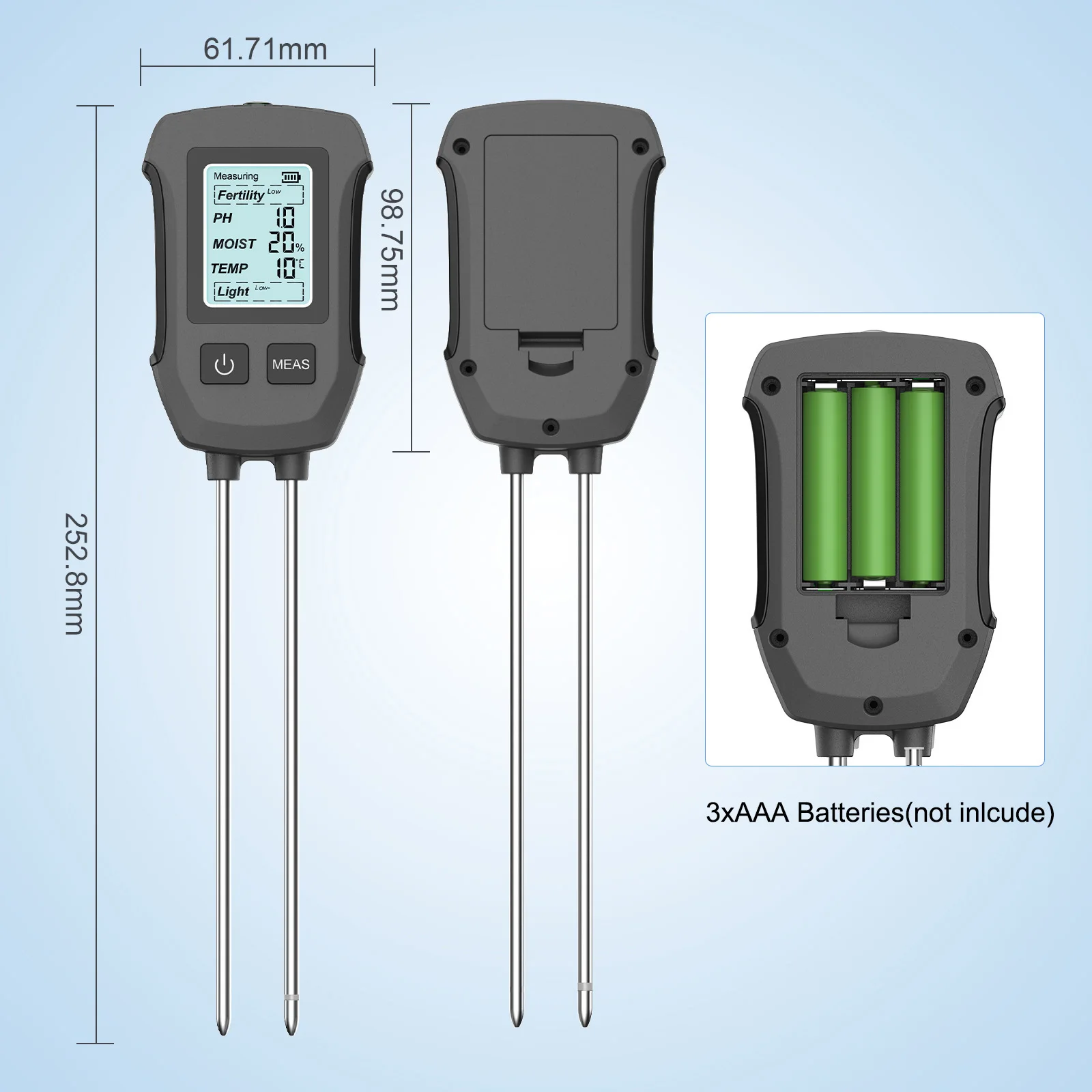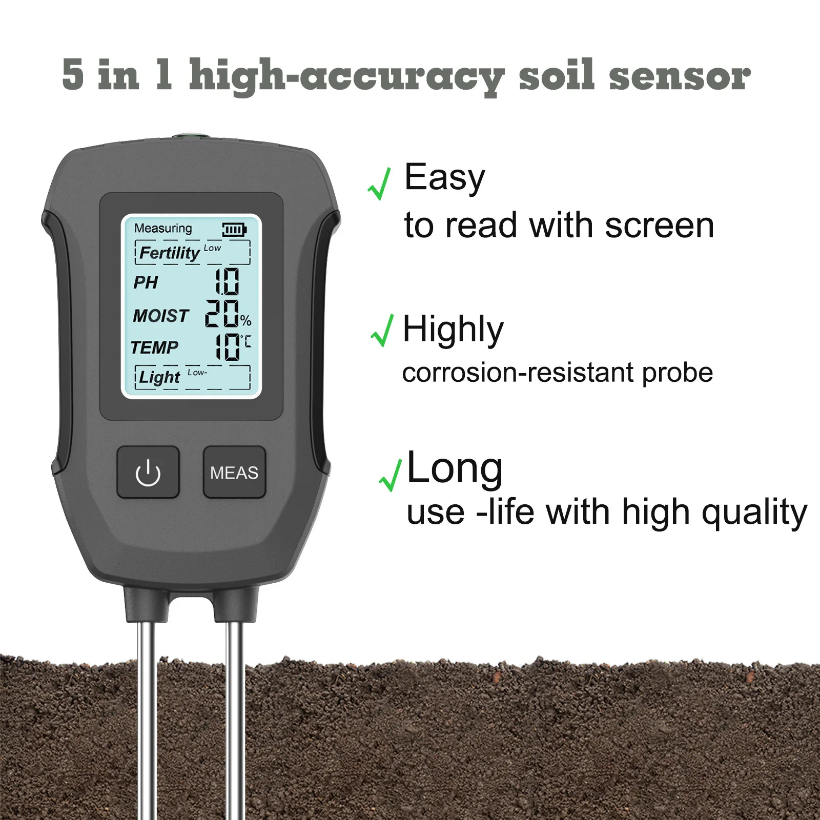 Comprar Probador de suelo 5 en 1, Sensor de PH/humedad/temperatura/fertilidad/luz, medidor Digital LCD, Monitor de humedad para plantas de flores y jardinería