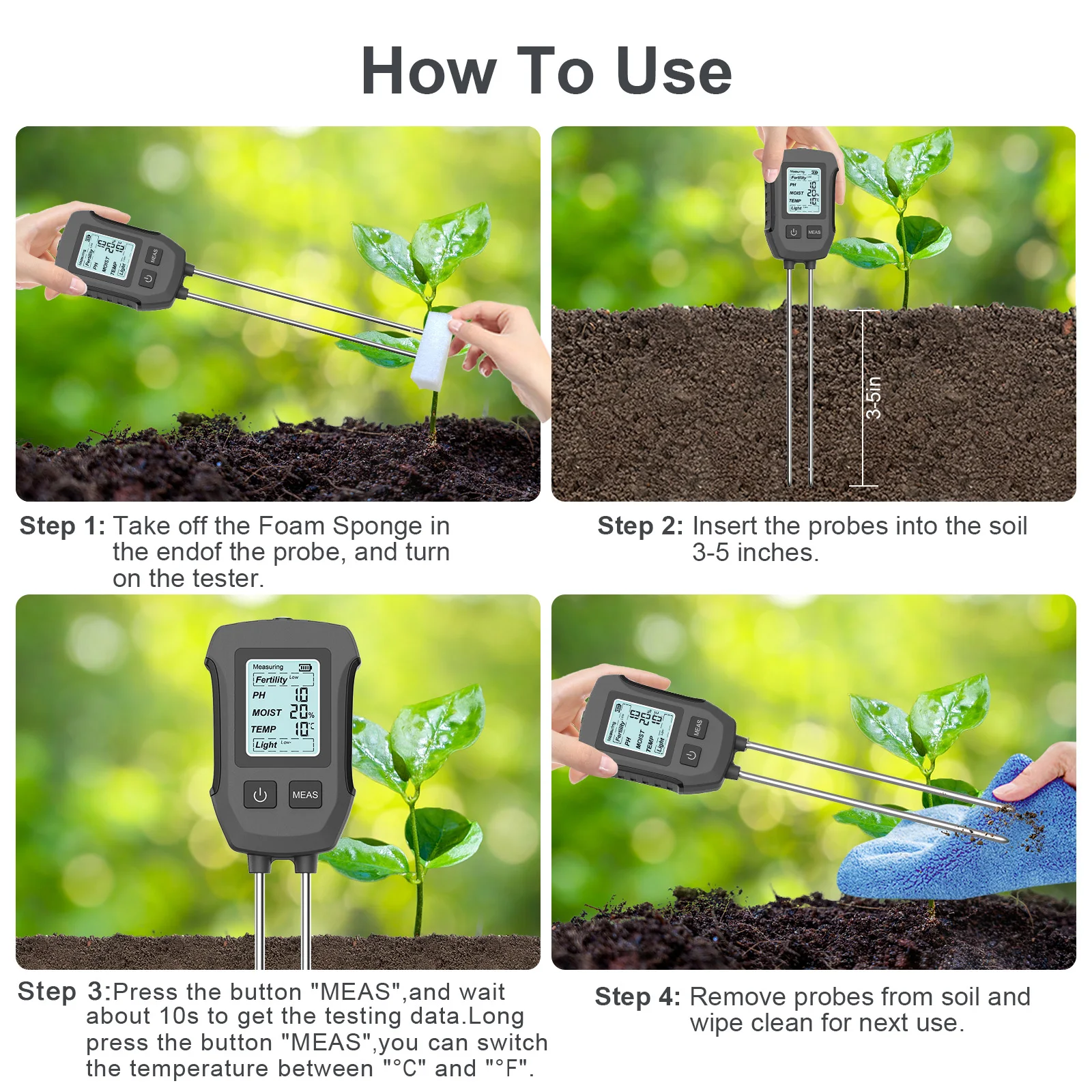 FÁCIL DE USAR: Simplemente inserte la sonda en el suelo entre 3 y 5 pulgadas (10 cm) y espere 10 segundos para que una lectura intuitiva obtenga una lectura precisa y precisa de inmediato.Después de su uso, simplemente retire la sonda del suelo y límpiela.