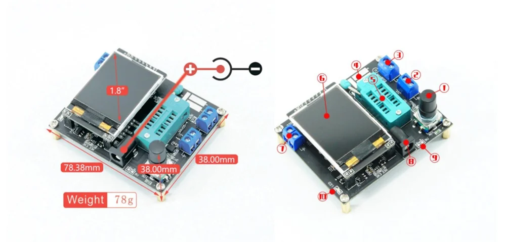 Detecta automáticamente transistores NPN y PNP, FET, diodos, diodo dual, tiristor, SCR, identificación automática del pinout del transistor.