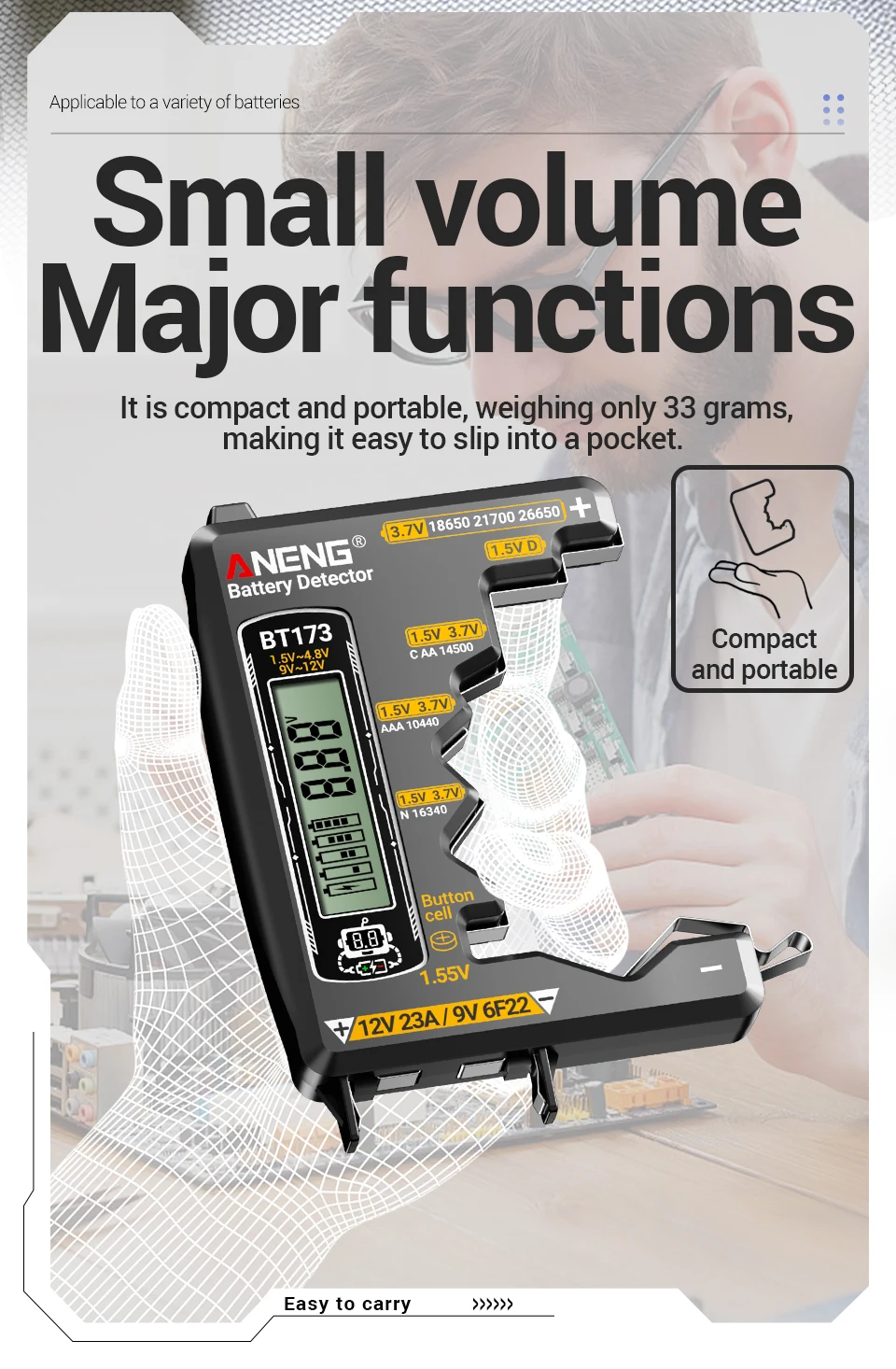 Probador de voltaje de batería ANENG BT173 Baterías de iones de litio Bar/Valor Detector de pantalla dual 18650 21700 12V 23A Herramientas electrónicas