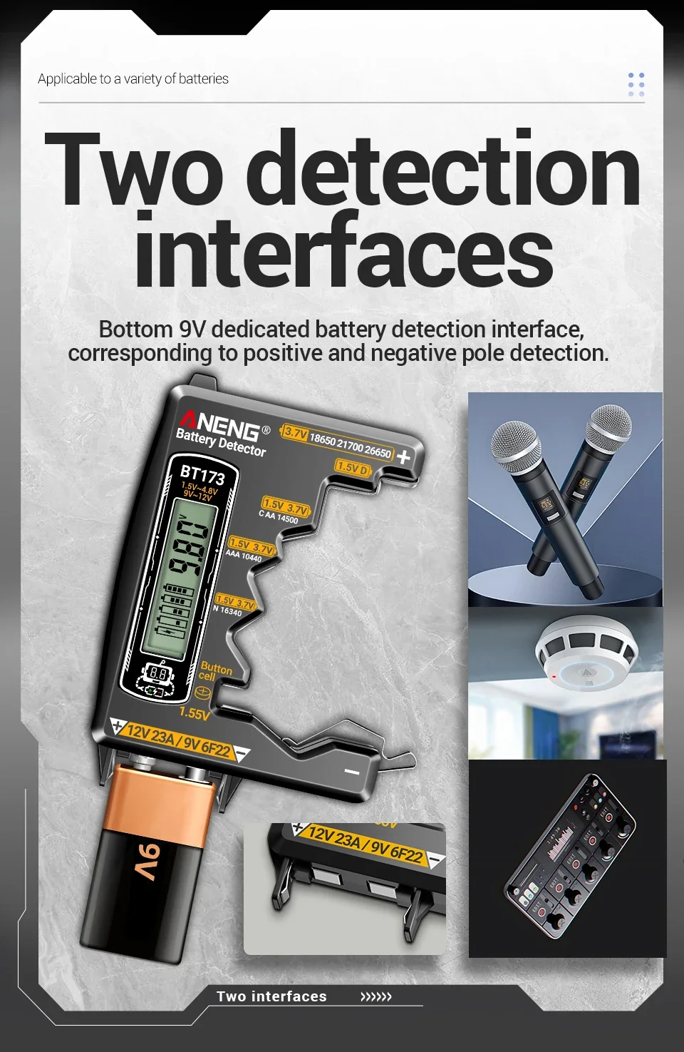 Detecta el nivel de energía de las baterías que oscilan entre 1,5 y 4,8 V y 9 ~ 12 V.