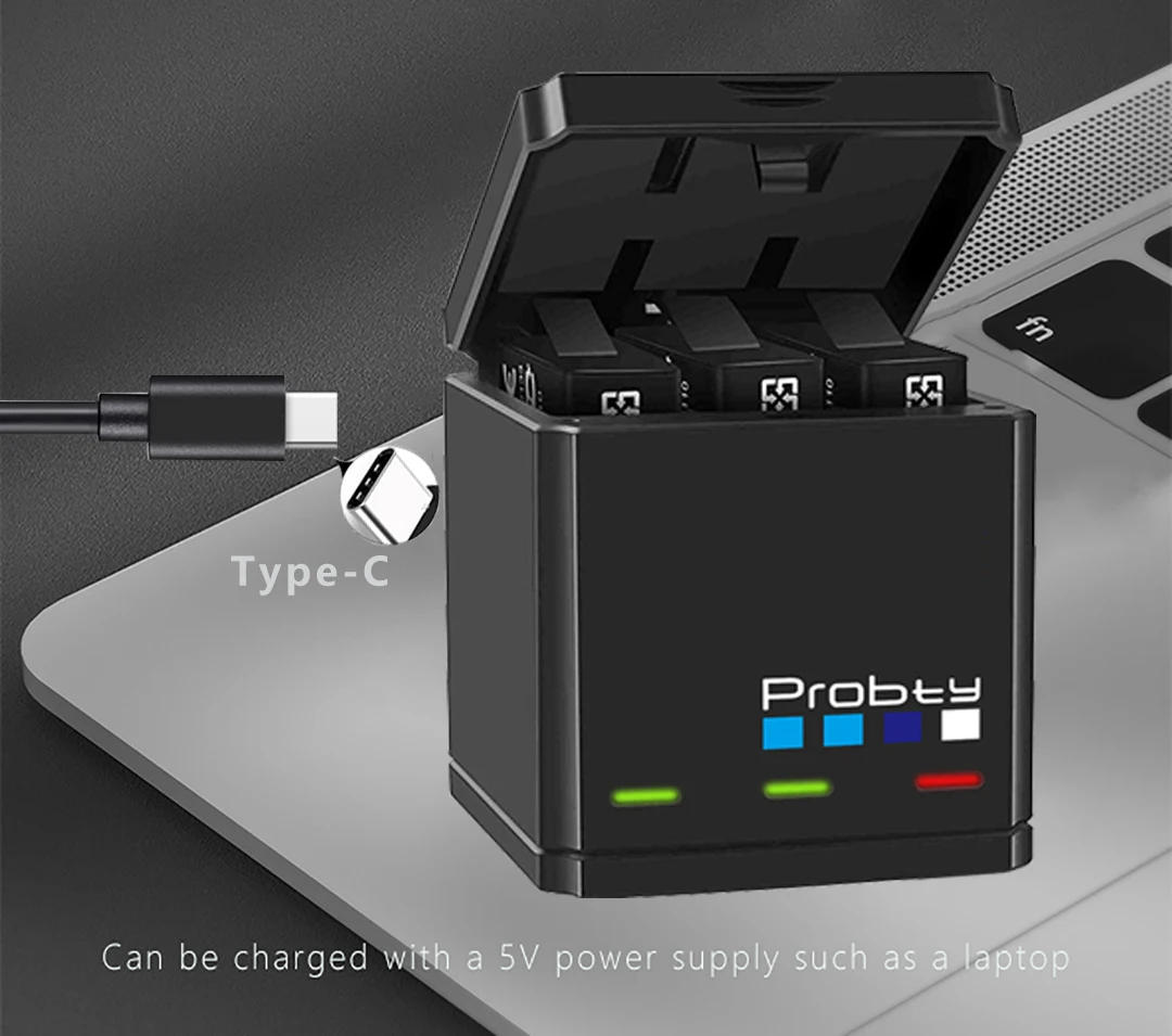 Característica;1.3 RANURAS: El cargador Mini USB de 3 ranuras puede cargar simultáneamente hasta 3 baterías.2.Tiempo de carga: solo se necesitan alrededor de 1,5 horas para cargar completamente 3 baterías a la vez.3.Tapones de cobre: fabricados con cobre de primera calidad para garantizar un alto rendimiento y estabilidad.4.Gran compatibilidad: funciona con la batería Probty y la batería Original GoPro5.El cargador de 3 canales Probty se puede alimentar con un adaptador de cargador de pared, un banco de energía o su PC, computadora portátil, etc.6.Interfaz tipo C: le permite alimentar el cargador de 3 canales con cable tipo C8.Protección de placa de circuito 100% segura9.Puede almacenar 3 baterías Hero 5/6/7/8.10.Diseñado para ser compacto, de tamaño pequeño y liviano,Esta caja de almacenamiento para cargar y transportar la batería es fácil de transportar para sus salidas.11.Indicar color ROJO cuando la batería esté cargando; Indicar color VERDE cuando se complete la carga.Lista de embalaje;1 caja de almacenamiento para cargador de 3 canales (pilas no incluidas)1 cable de carga USB tipo C.