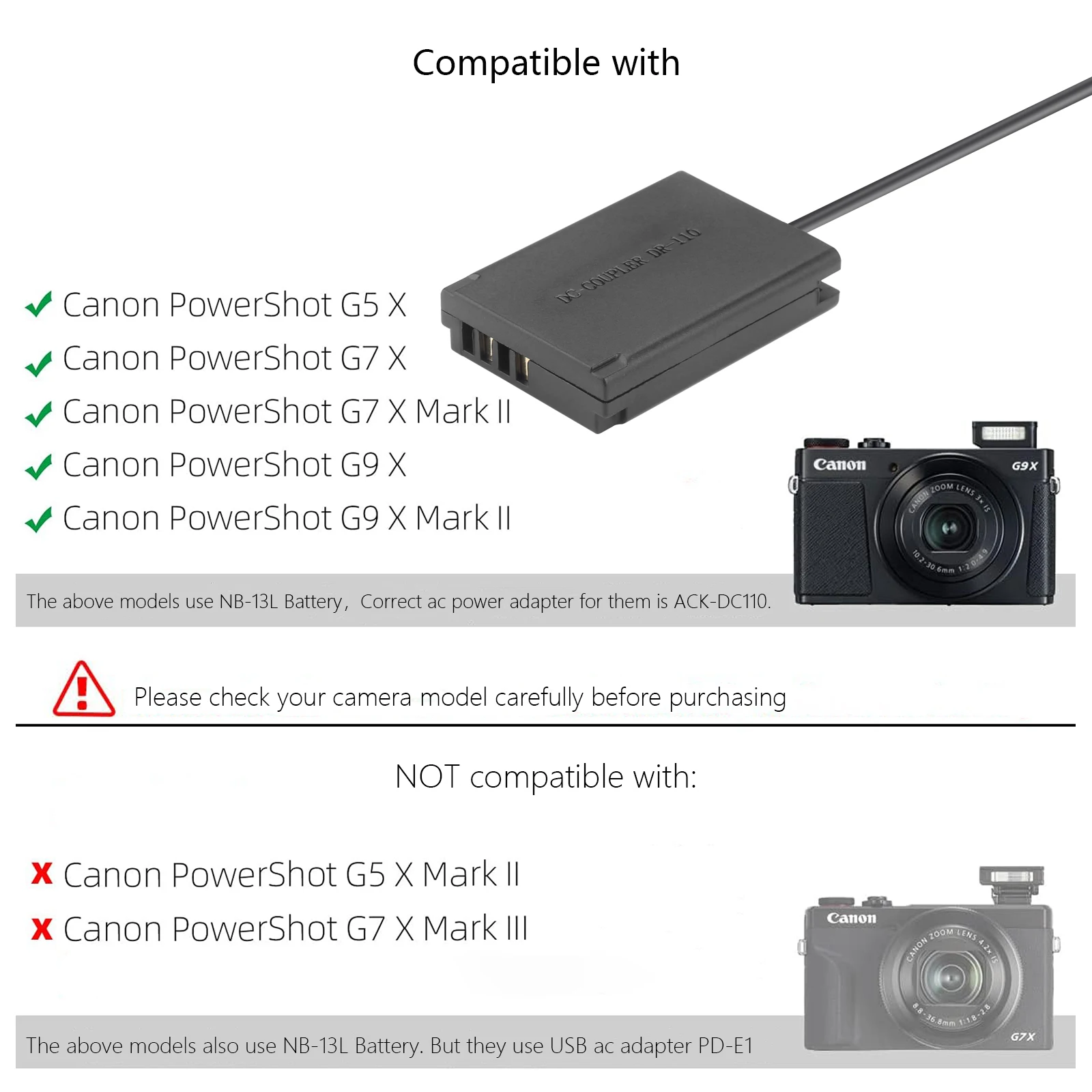 Comprar Probty NB13L NB-13L batería simulada DR-110 USB-A adaptador de corriente acoplador CC para Canon G7X2 G7X3 G5X2 G9X2 G1X3 G5X G9X SX620 SX720