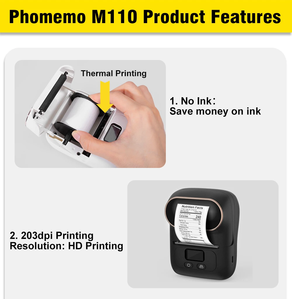 Impresora térmica Phomemo M110 Impresoras Portatil Impresora de etiquetas BT sin tinta portátil inalámbrica Uso de etiquetas autoadhesivas, papel