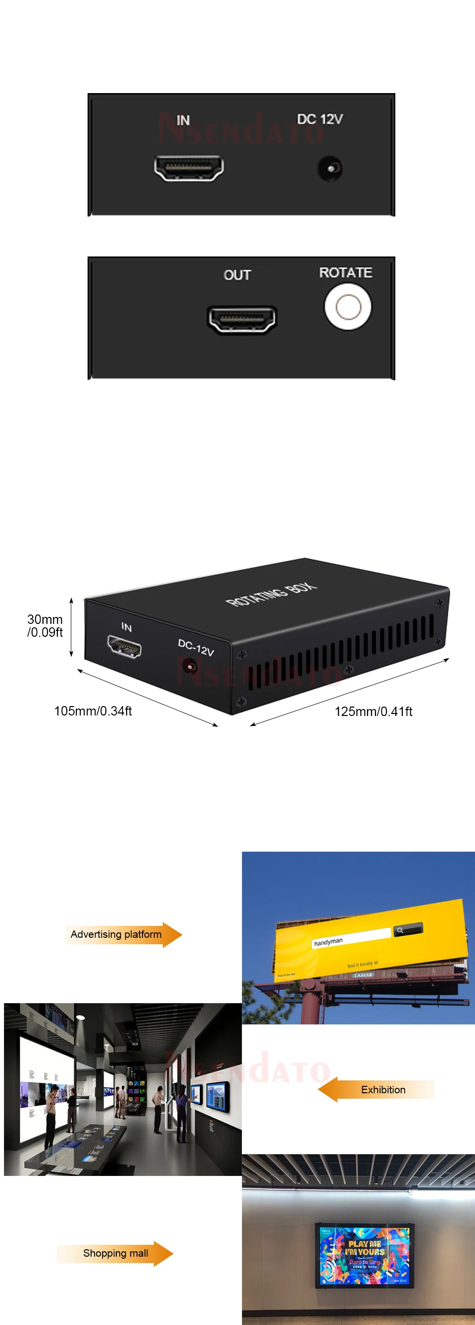 Nsendato Vertical rotating box is a video rotating processor for HDMI-compatible vertical screen. It supports HDMI-compatible(audio build-in) HDMI-compatible(audio build-in),and HDMI-compatible output simultaneously. It supports output 90 180 or 270 degree rotation or miror(right, left, up, down) video. Its high integration and cost-effective design make this device widely used in special vertical screen display project.