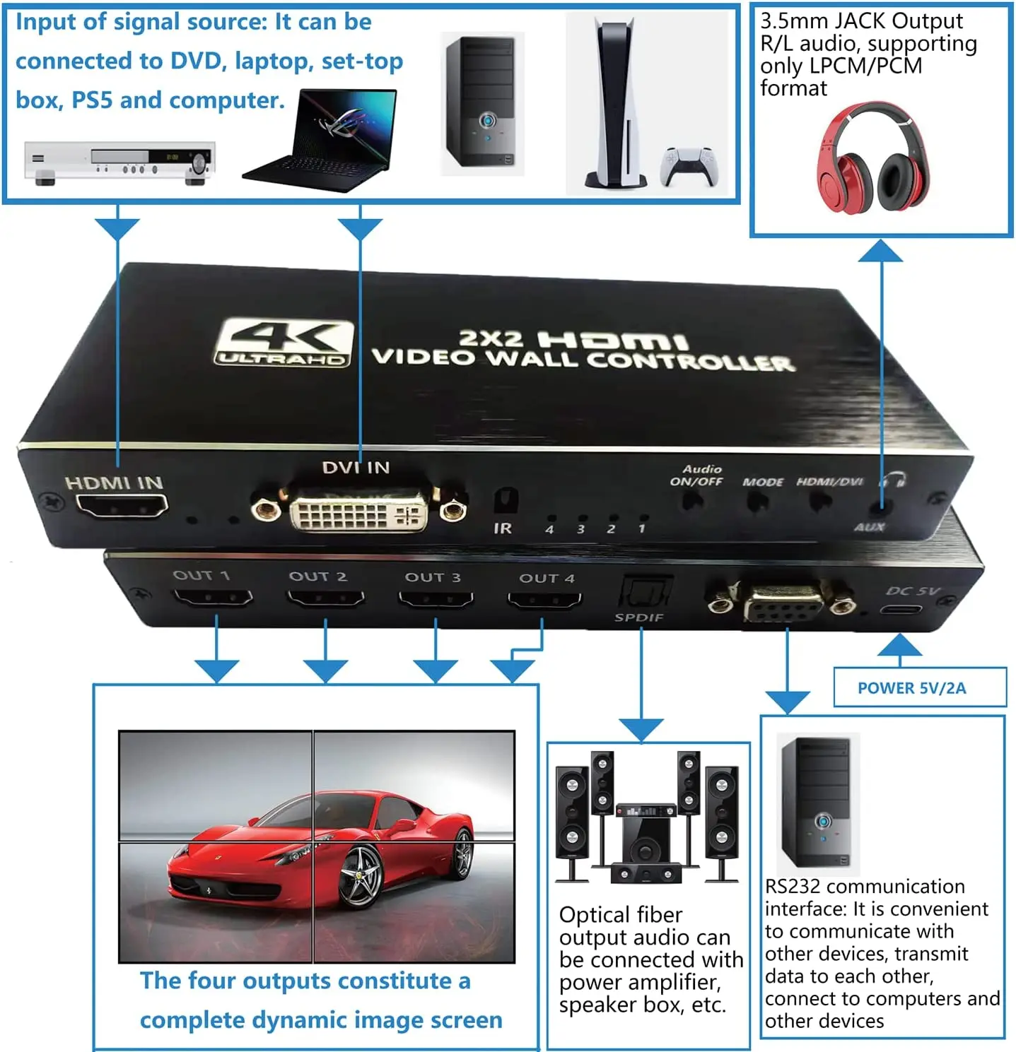 2x2 procesador de controlador de pared de vídeo 1x2 1x3 1x4 2x1 3x1 4x1 4K HDMI controlador de pared de vídeo TV procesador de pared de costura de vídeo