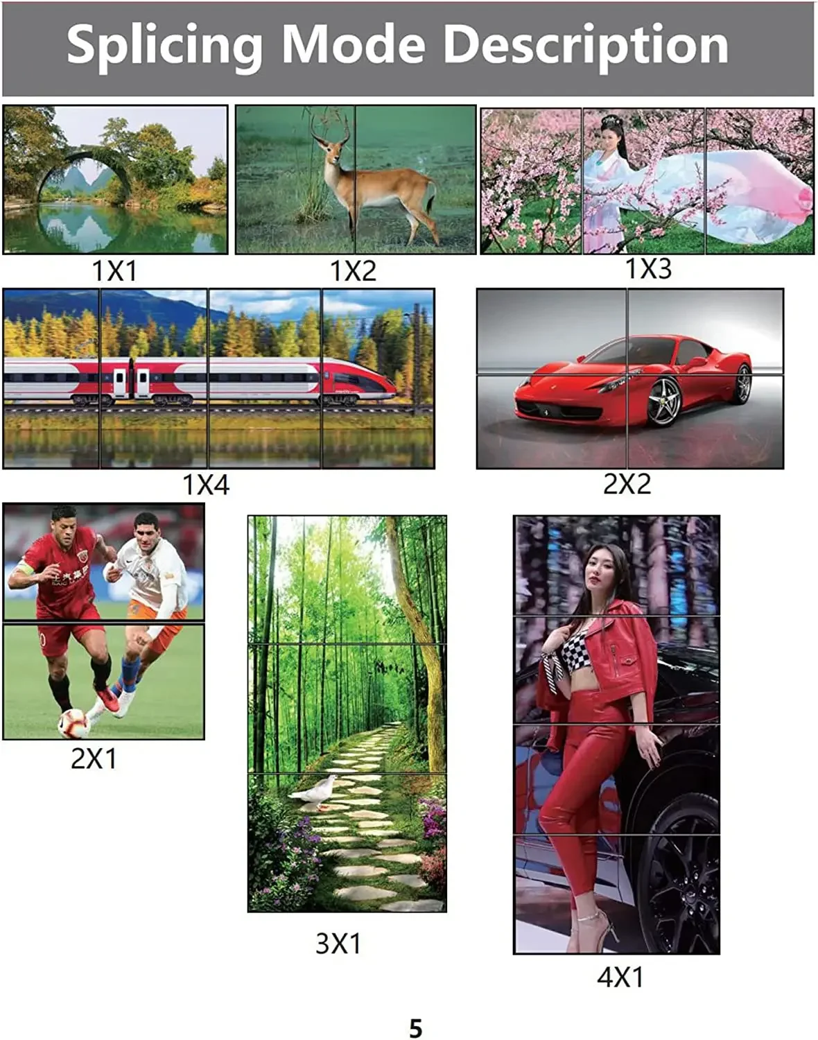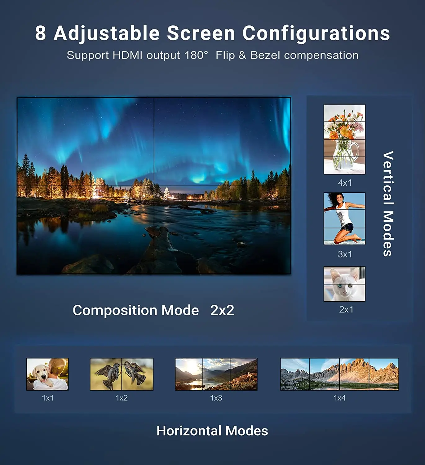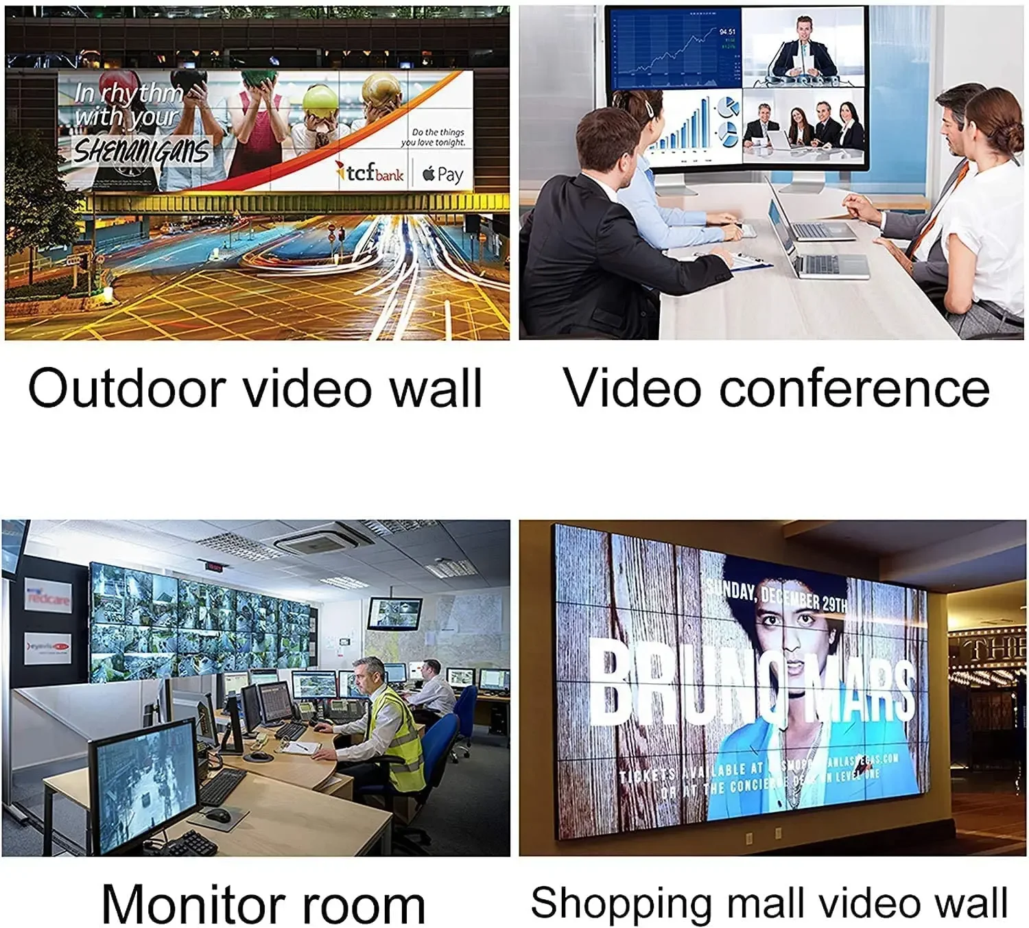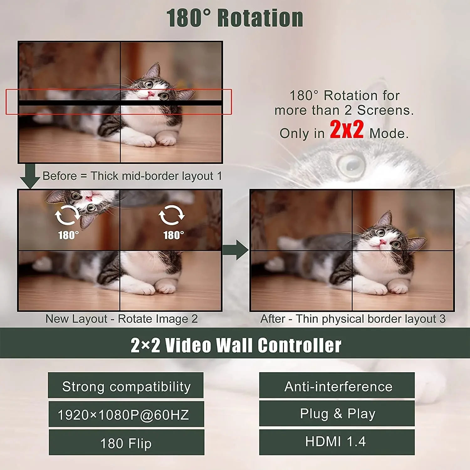 Controlador de video wall HDMI: el procesador de pared HDMI TV puede distribuir un dispositivo de señal de entrada HDMI o DVI (DVD, TV Box, Xbox, Roku, computadora, etc.)hasta 4 salidas HDMI muestran pantallas simultáneamente, que a través de pantallas de empalme LCD puede formar una pantalla de video grande y dinámica completa y pantallas de señalización digital, brindándole una experiencia visual increíble.NOTA: Utilice videowall profesionales en lugar de televisores.