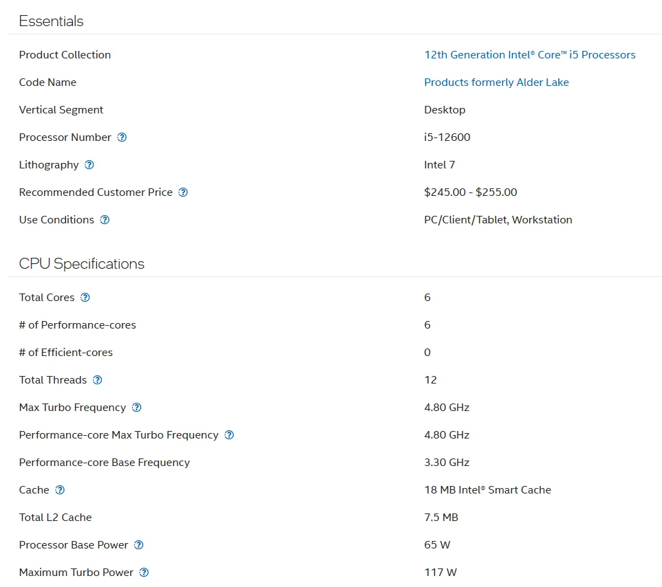 Procesador CPU Core i5 12600 3,3 GHz 6-Core 12-Thread 10NM 65W LGA 1700