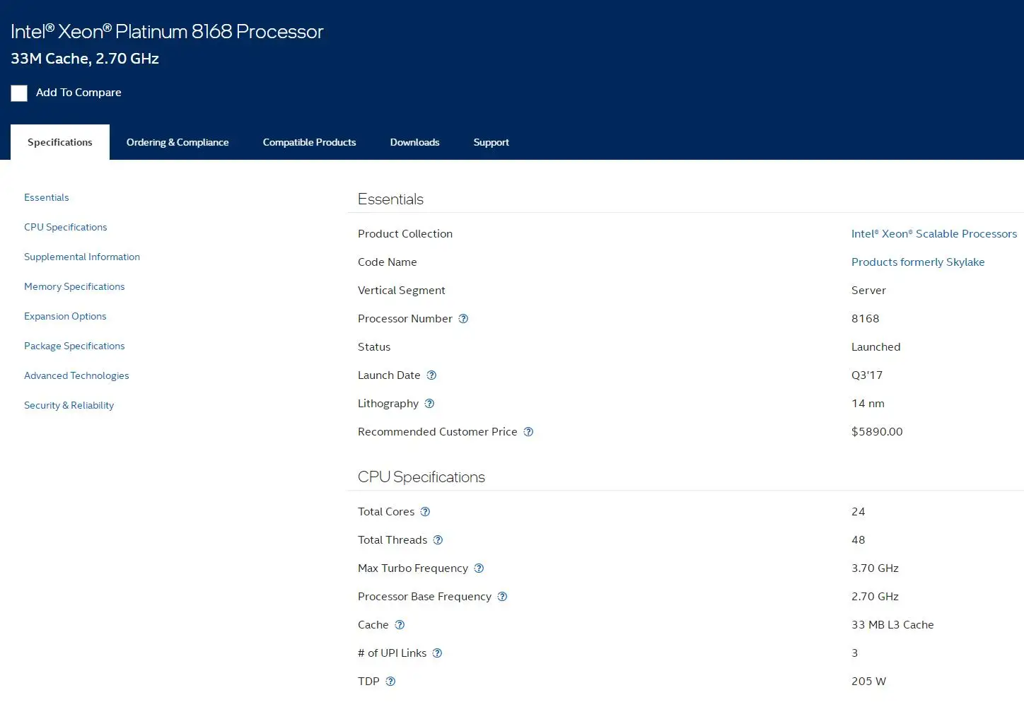 Comprar Procesador Platinum 8168 para procesadores escalables Xeon 24 núcleos 48 hilos Frecuencia base 2,70 GHz Frecuencia turbo 3,70 GHz
