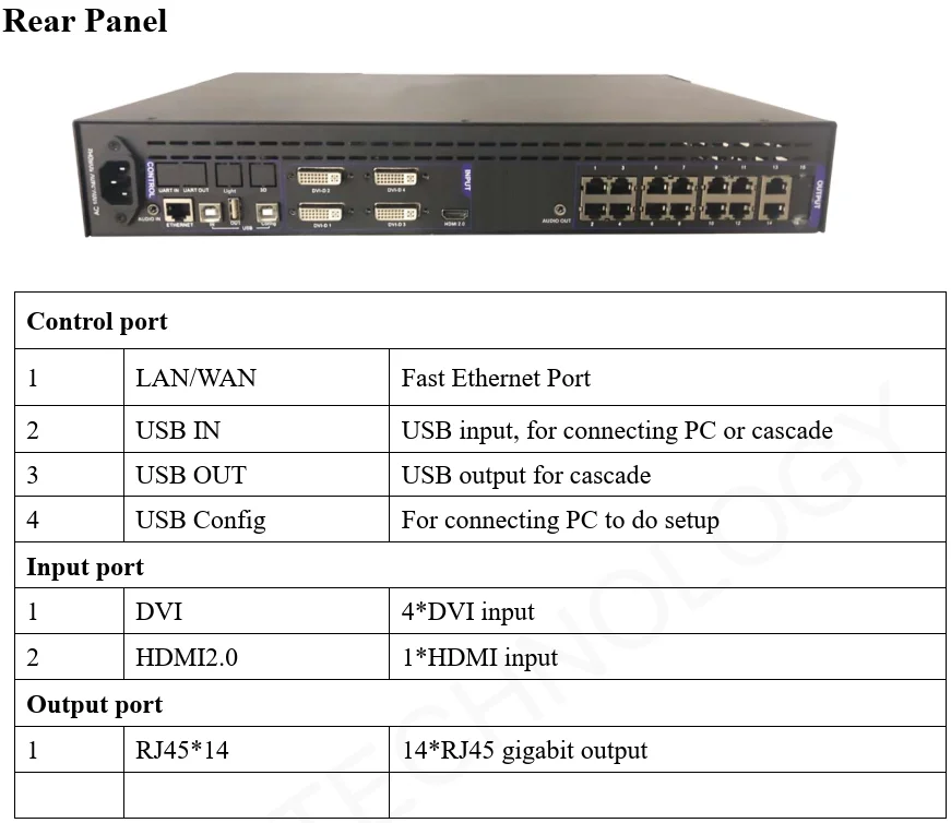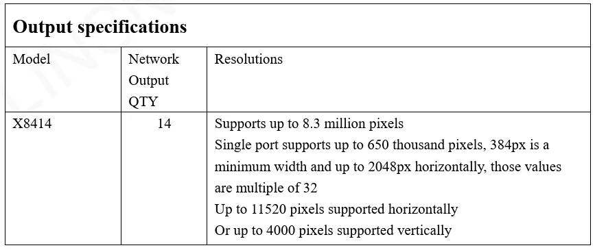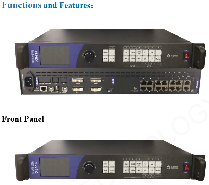 X8414 is a two-in-one (sender plus video processor) 4-layer-output controller designed and produced by Linsn, which supports up to 8.3 million pixels. It has 14 Gigabit outputs for up to 11520pixels in width or 4000pixels in height