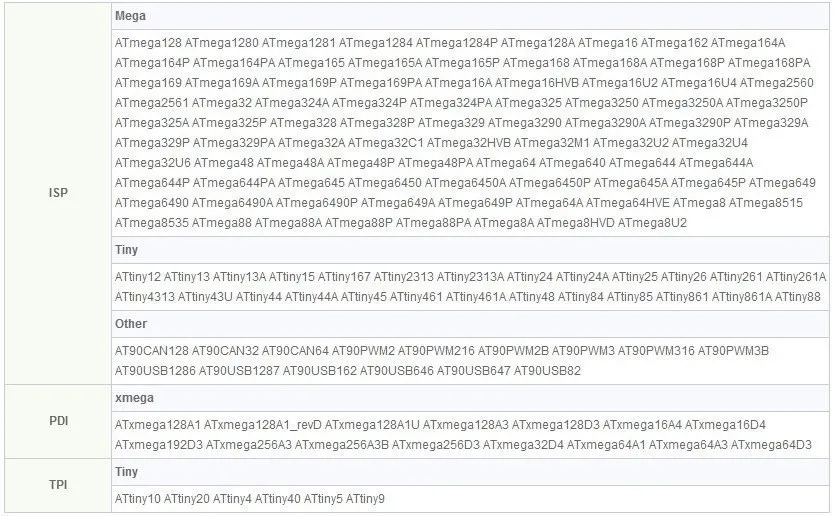 1.Admite todos los dispositivos AVR con interfaz ISP o PDI y ciertos 51 dispositivos