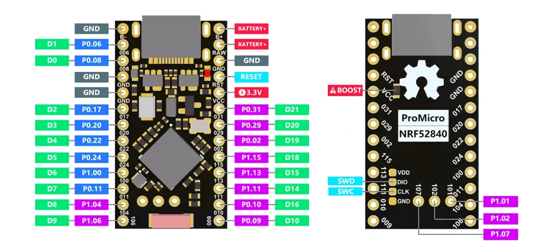 02.Potente CPU: el chip NRF52840 utiliza un procesador ARM Cortex-M4F con una velocidad de reloj de 64 MHz, memoria flash incorporada de 1 MB y 256 KB de RAM