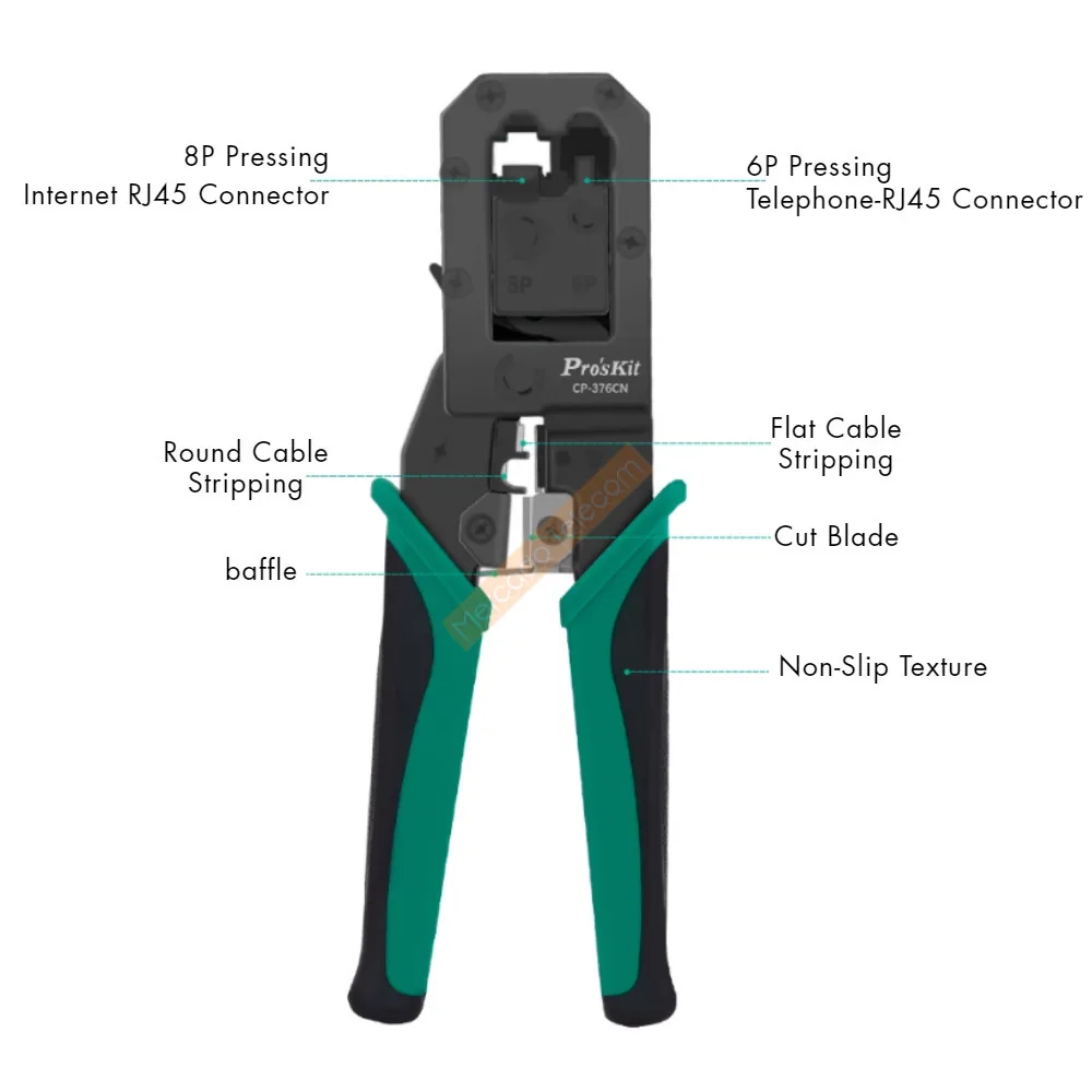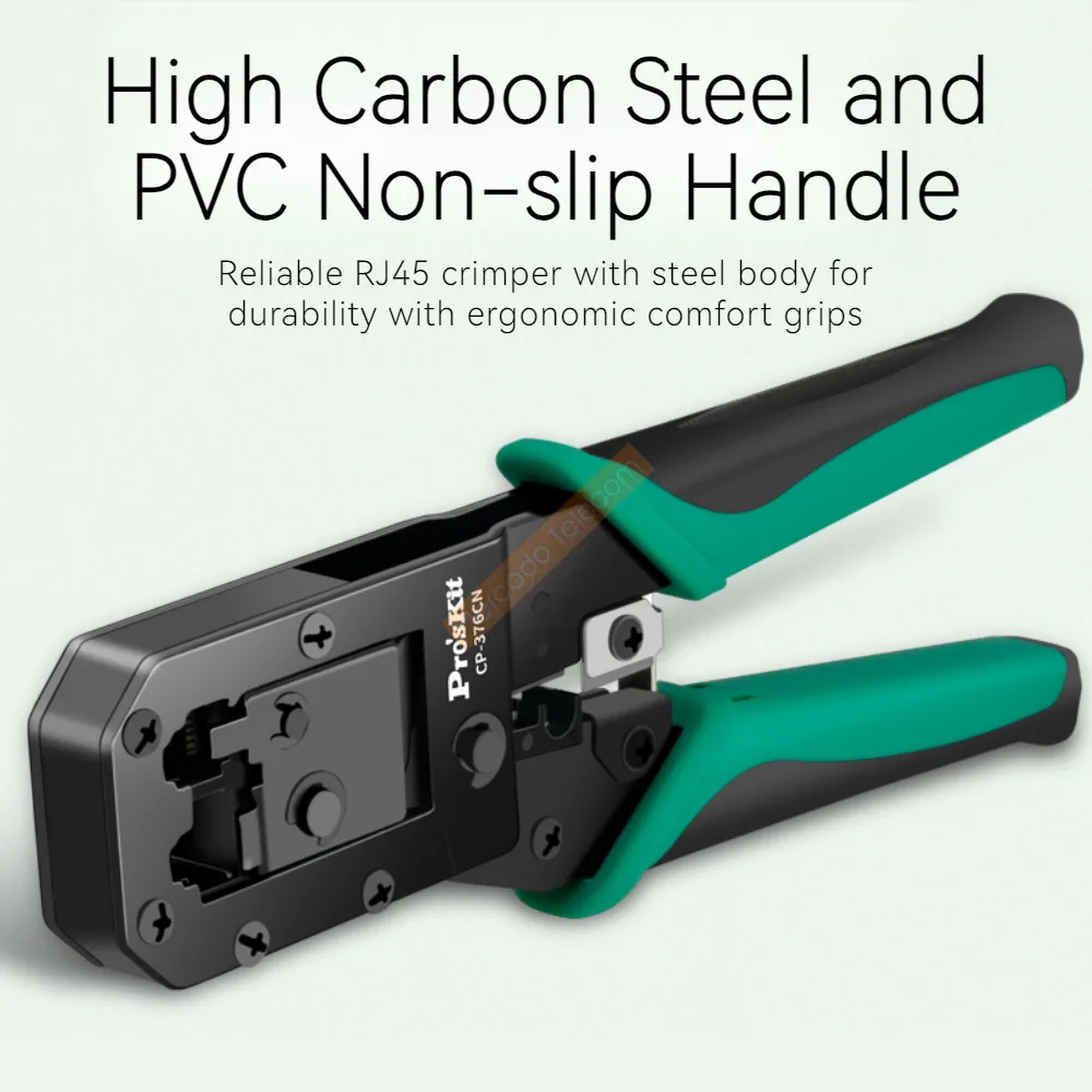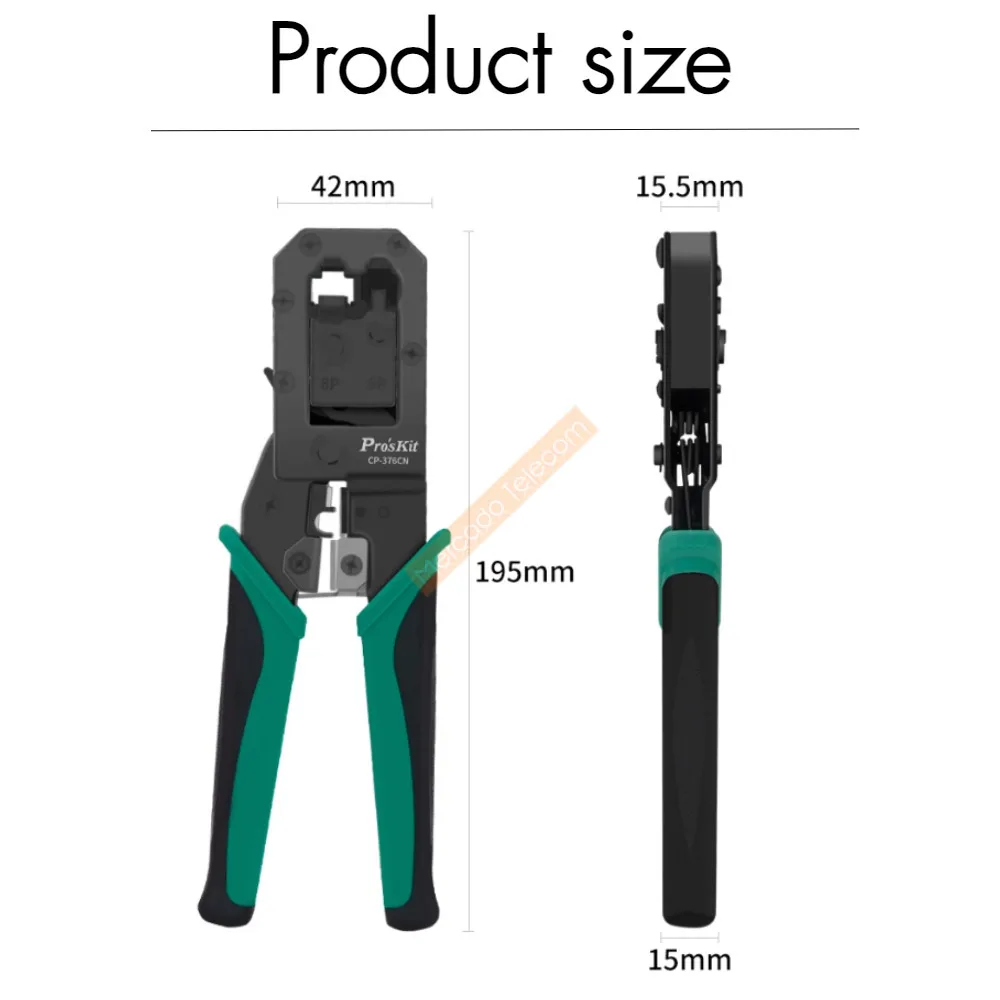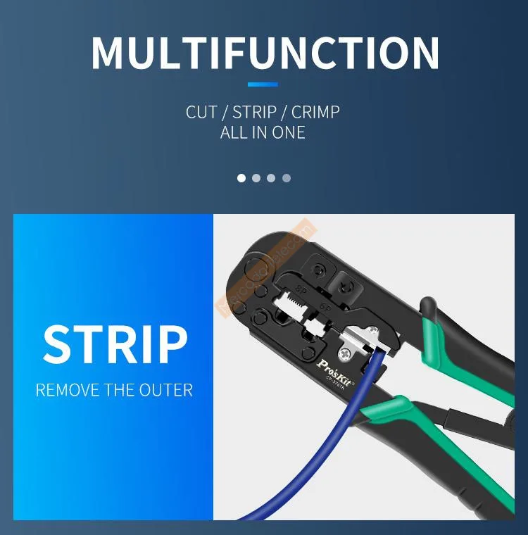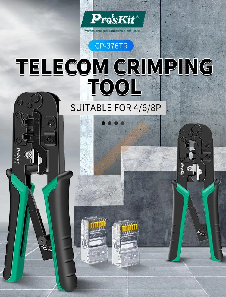 La herramienta de engarzado para telecomunicaciones Pro'sKit CP-376TR 4P/6P/8P es una herramienta de calidad profesional diseñada para engarzar de forma precisa y confiable varios conectores modulares.Con su diseño de mango de dos colores, la herramienta ofrece un agarre cómodo y una fácil identificación de la orientación del mango.El sistema de ahorro de fuerza del trinquete garantiza que el usuario pueda aplicar una presión constante durante todo el proceso de engarzado, reduciendo la fatiga y aumentando la eficiencia.