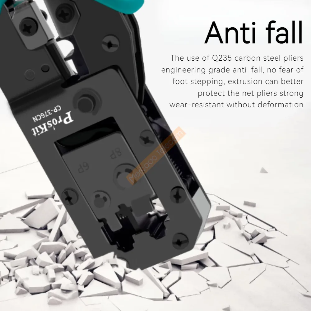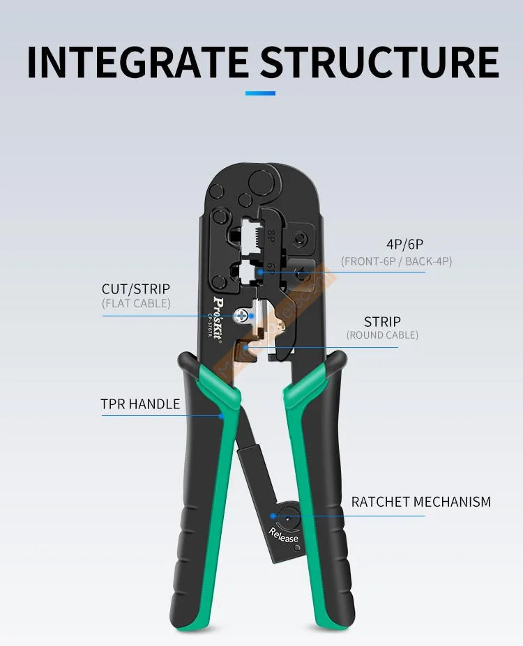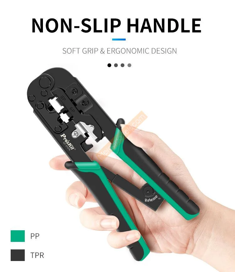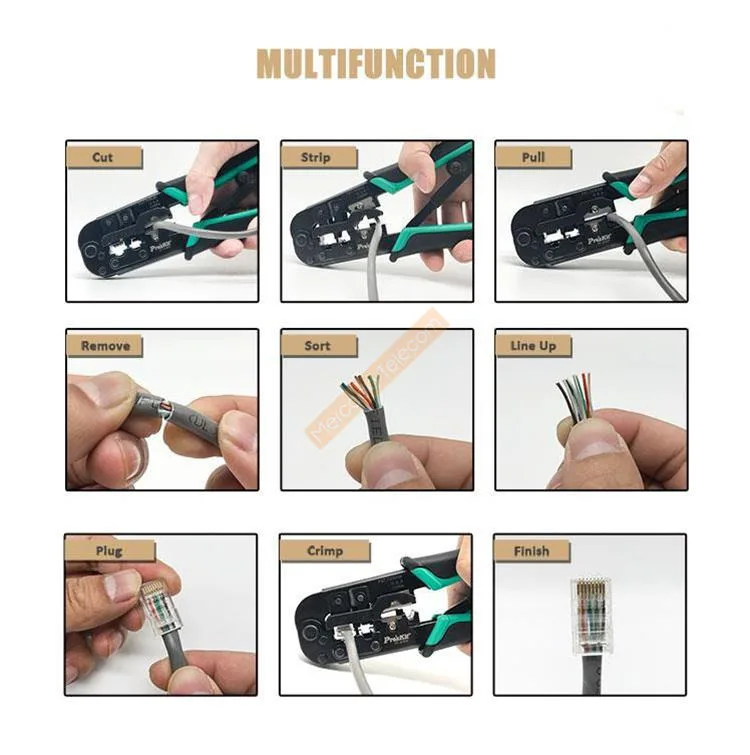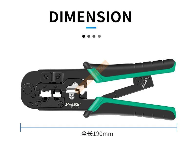 La herramienta de engarzado para telecomunicaciones Pro'sKit CP-376TR 4P/6P/8P es una herramienta de calidad profesional diseñada para engarzar de forma precisa y confiable varios conectores modulares.Con su diseño de mango de dos colores, la herramienta ofrece un agarre cómodo y una fácil identificación de la orientación del mango.El sistema de ahorro de fuerza del trinquete garantiza que el usuario pueda aplicar una presión constante durante todo el proceso de engarzado, reduciendo la fatiga y aumentando la eficiencia.