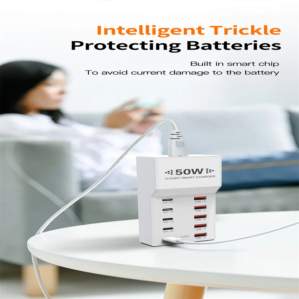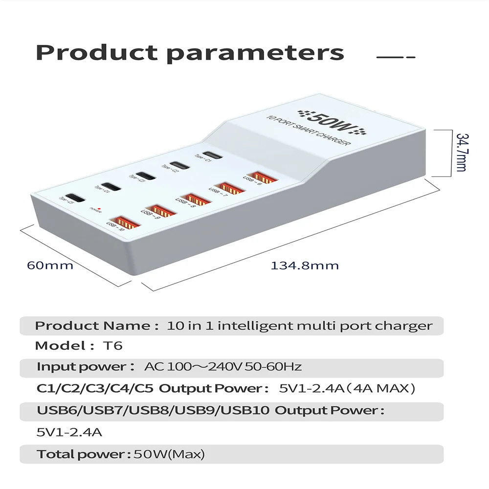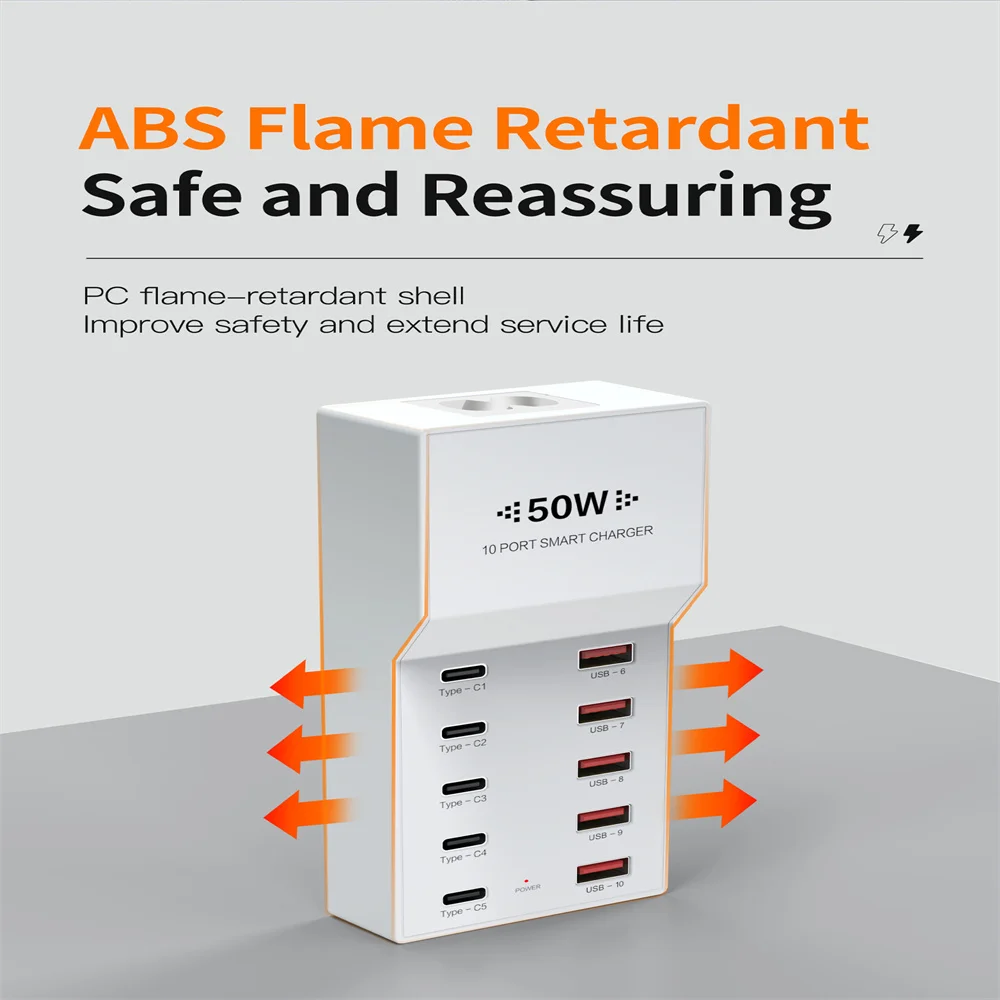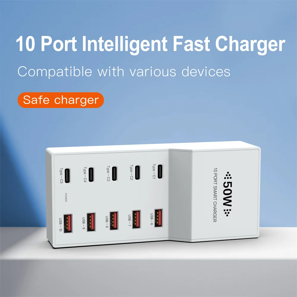 Protección de seguridad múltiple La carga simultánea viene con 50W 10 puertos para acortar el tiempo de carga Cargador seguro y rápido