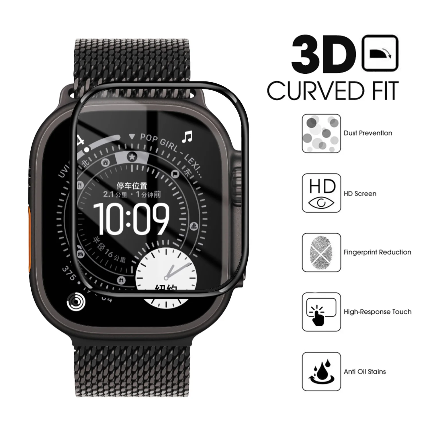 Alta sensibilidad de pantalla, sensación táctil cómoda. A prueba de golpes, máxima protección del reloj.Inastillable y resistente a los arañazos. Este protector de pantalla protege eficazmente su reloj inteligente del agua, el aceite y las gotas de lluvia.La pantalla altamente transparente, de alta calidad y resistente a las huellas dactilares mantiene su color y brillo originales. Material: PMMA + PC Compatible con: Para Apple WatchUltra 1/2/3 Dimensiones: Ultra 1/2/3 Características: Alta definición