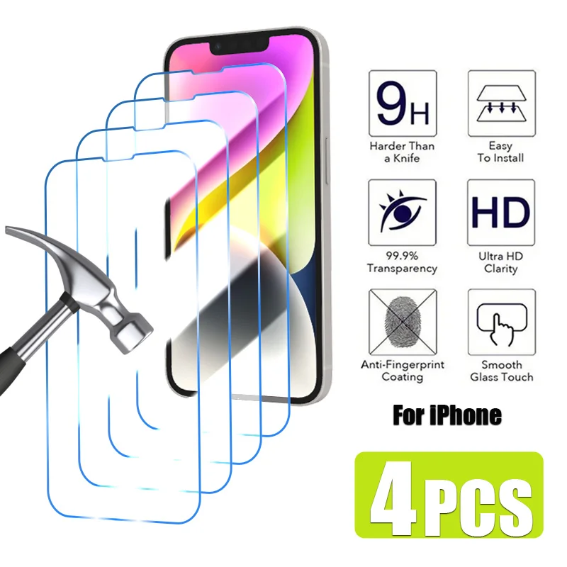 Protector de pantalla de 4 piezas para iPhone 15 14 13 12 11 Pro Max Mini vidrio templado para iPhone 14 15 Plus XR X XS Max SE 2022 2020