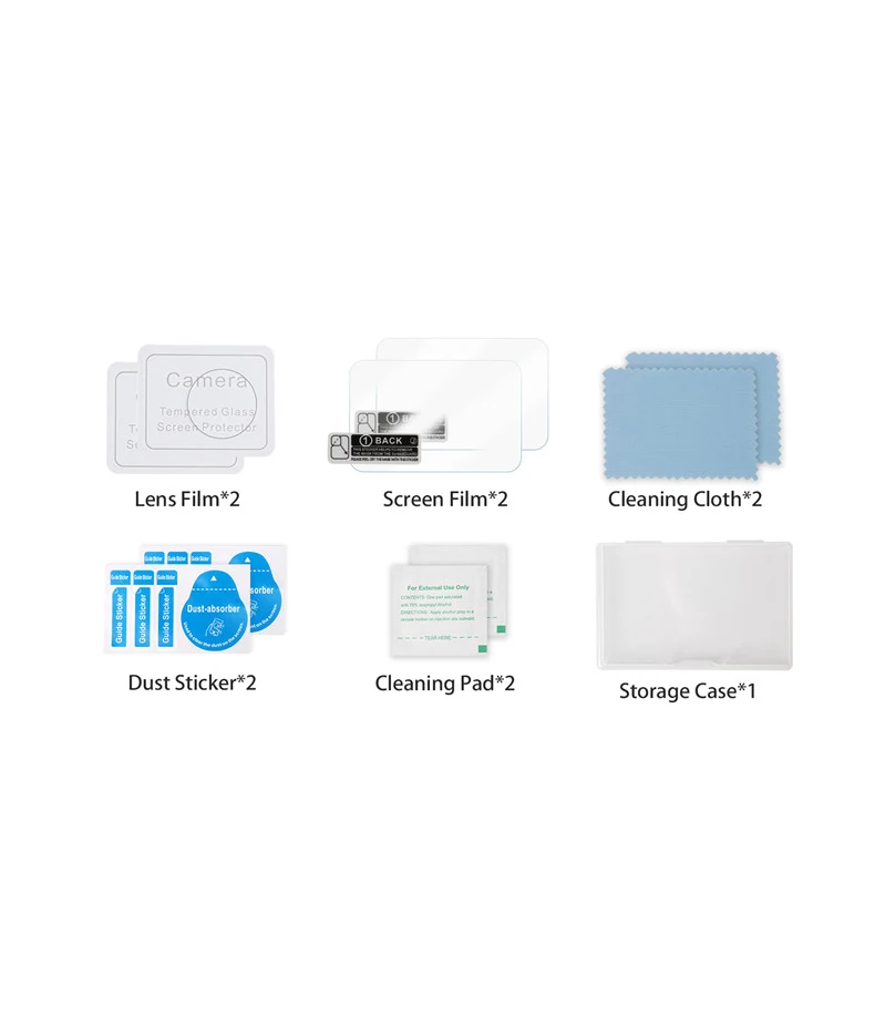 Protectores de pantalla de película de buena calidad. La pantalla es de cristal, pero la lente es solo de plástico, lo cual no es genial. He deseado los de las lentes y usado solo el de la pantalla que no es perfecta, pero cubre la pantalla decente.