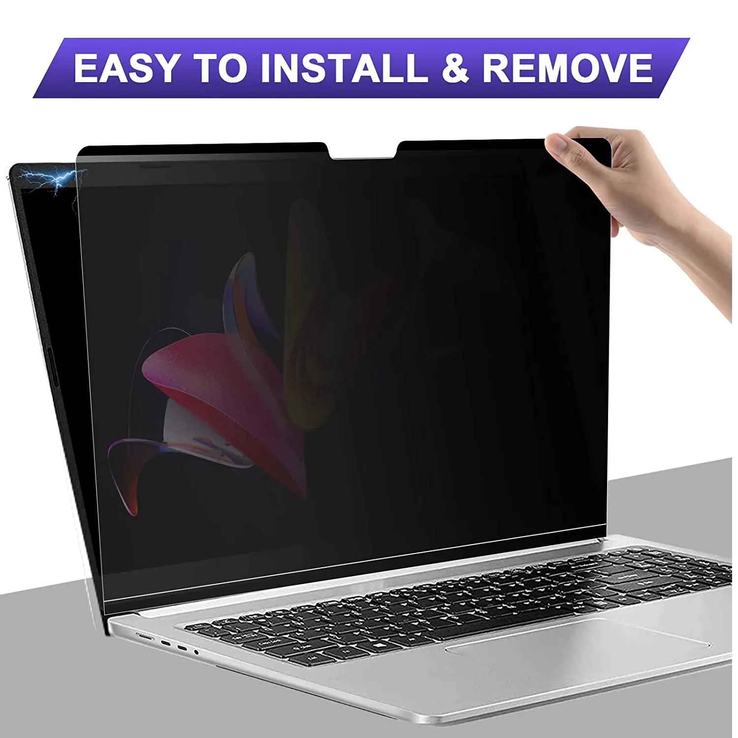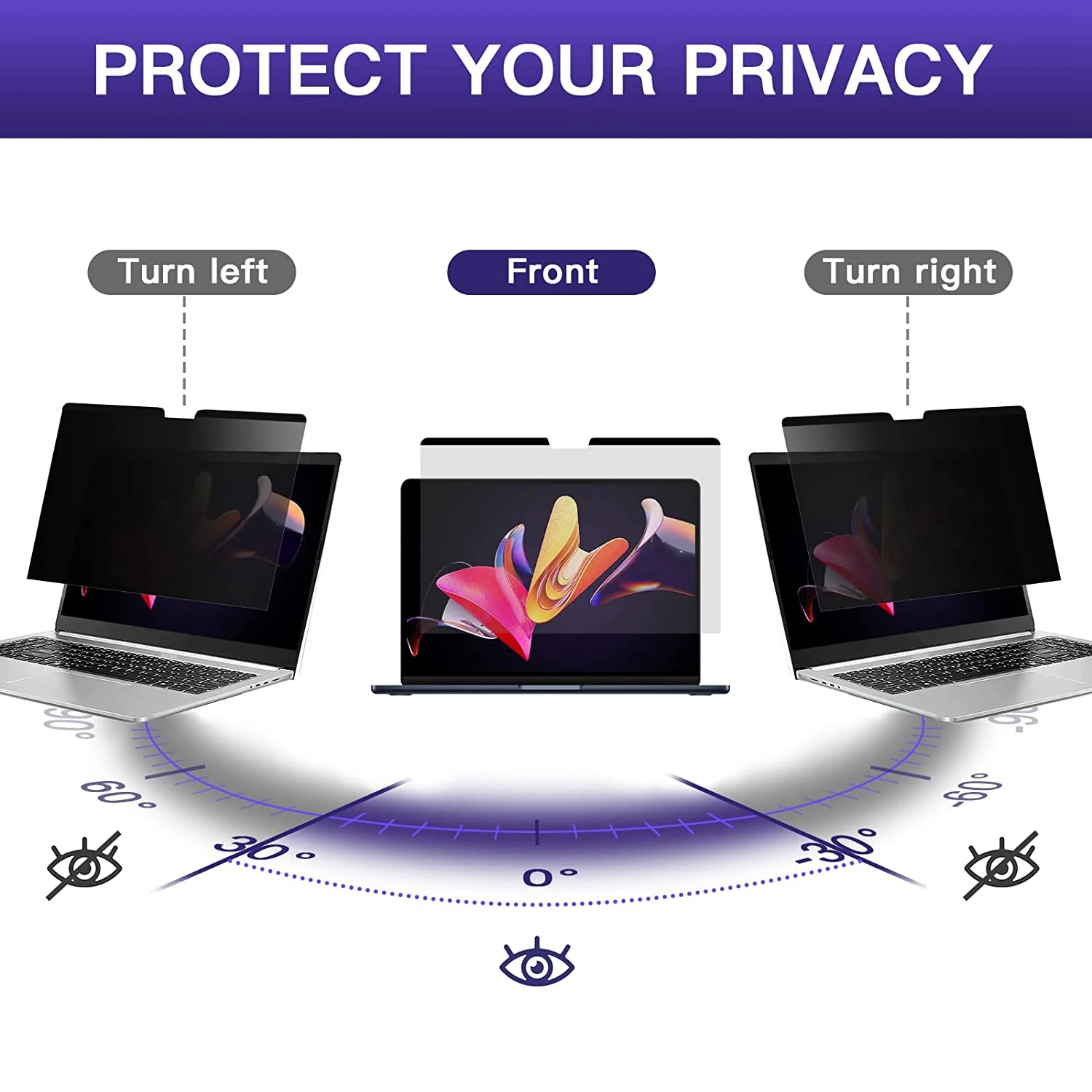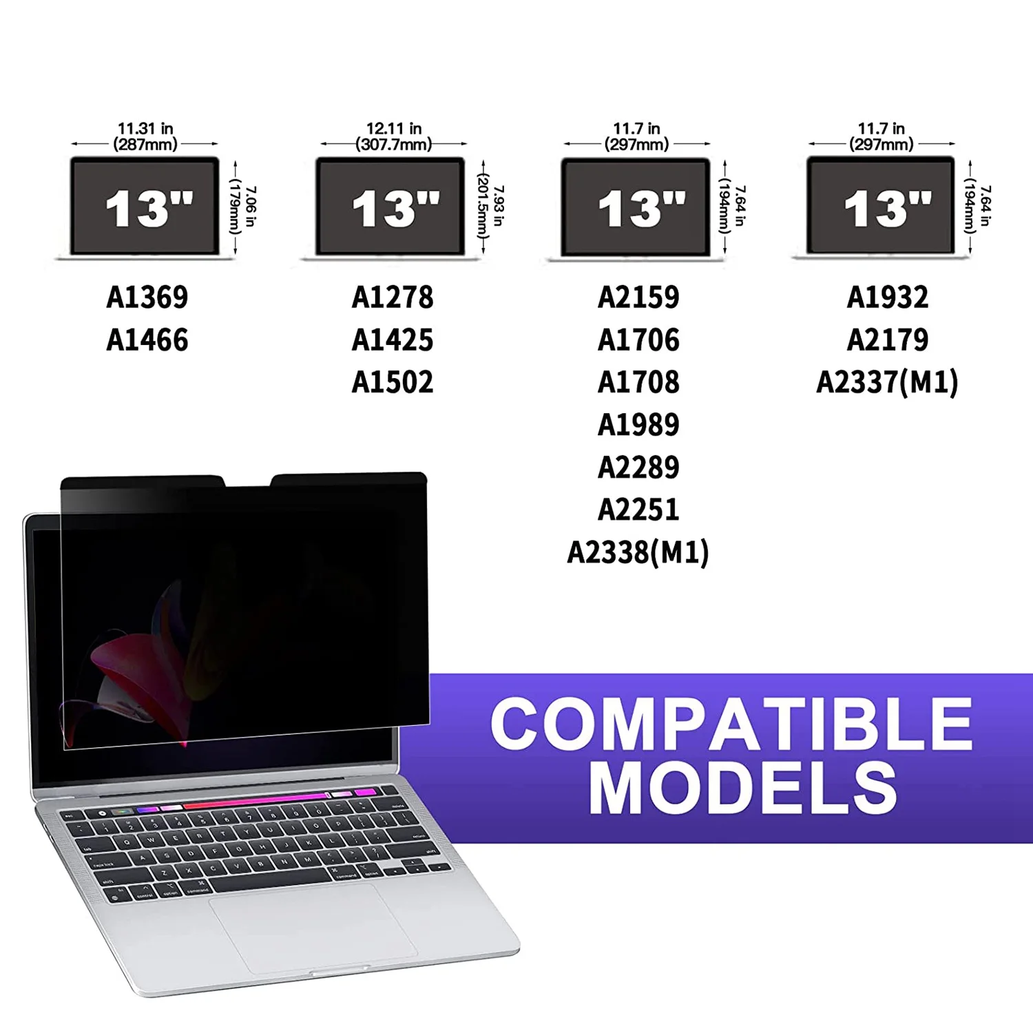 [COMPATIBILIDAD]:Compatible con MacBook Air de 13 pulgadas (2018, 2019, 2020, 2021, M1)(Modelo: A1932, A2179, A2337) y MacBook Pro de 13 pulgadas (2016, 2017, 2018, 2019, 2020, 2021, M1,M2)(Modelo: A1706, A1708, A2159, A1989, A2251, A2289, A2338). [MANTÉN SU PRIVACIDAD SEGURA]: La Pantalla de privacidad del MacBook Pro limita el ángulo de visión a +/-30 grados, donde la información en la pantalla solo es claramente visible para la persona sentada directamente frente a la pantalla, mientras que la persona sentada a su lado que solo ve una pantalla negra sólida. [Accesorio magnético y sin burbujas]: La parte superior de la pantalla de privacidad del portátil tiene una banda magnética reforzada, que se puede instalar en 1 segundo simplemente alineándolo con el bisel superior de la pantalla y presionándolo suavemente. Diseño extraíble. (La carpeta de archivos blanca incluida en el paquete se puede usar para almacenar el protector de pantalla del MacBook Pro retirado de la pantalla para evitar que se pierda o se manche). [PROTEJA SUS OJOS]: La PANTALLA DE PRIVACIDAD DE MacBook puede bloquear eficazmente la luz azul dañina entre 380nm ~ 495nm del rango de onda de las luces visibles y la luz azul, para reducir la fatiga ocular digital al ver pantallas y le da un mejor sueño. Color: Color de la foto Material:PET Contenido del paquete: 1 x Protector de pantalla para portátil Solo el contenido del paquete anterior, otros productos no están incluidos. Nota: El reflejo de la luz y las diferentes pantallas pueden hacer que el color del artículo en la imagen sea un poco diferente del real. El error de medición permitido es +/- 1-3cm.