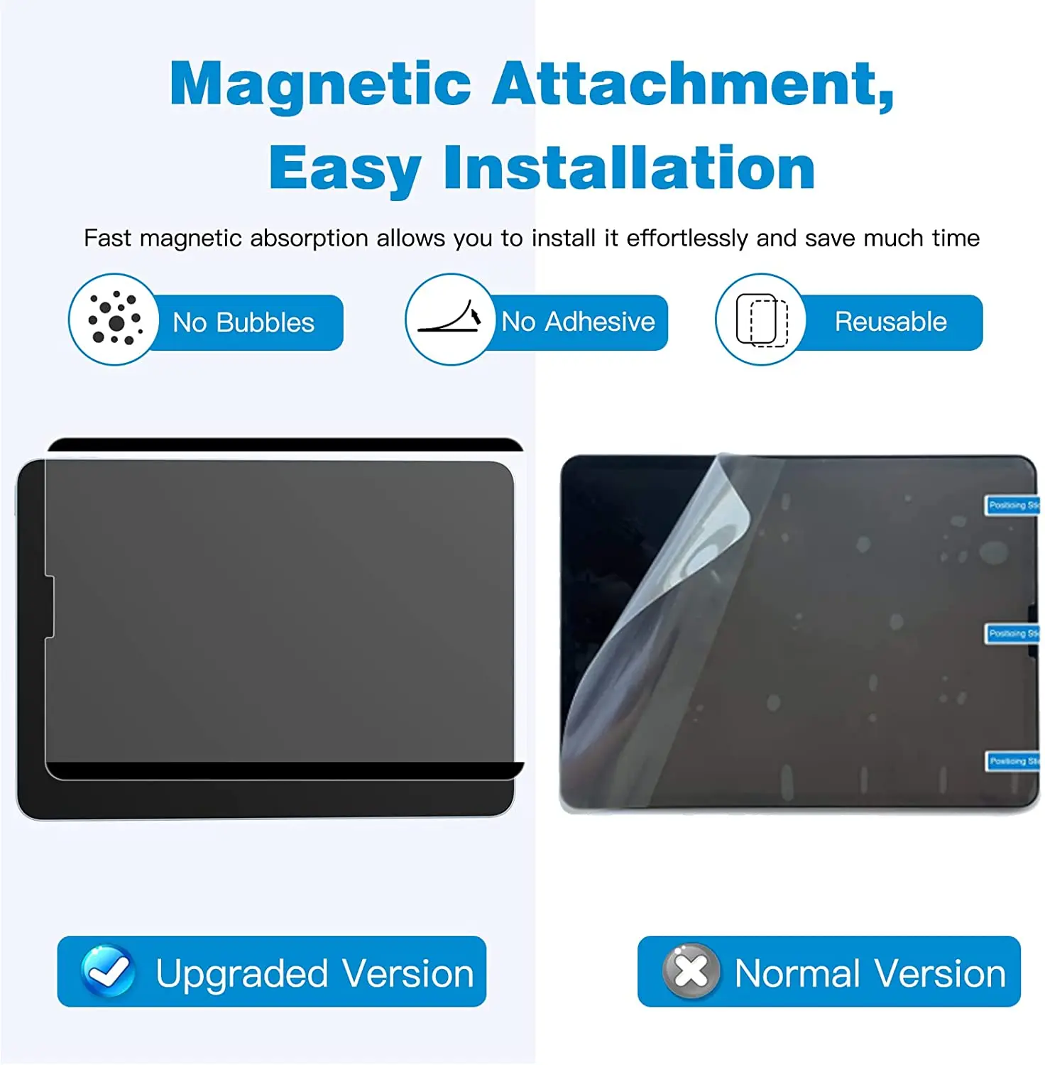 El diseño magnético hace que el protector de pantalla se fije automáticamente a la pantalla sin problemas. Fácil de quitar y volver a colocar cuando lo necesite, 100% sin burbujas y extraíble. No hay residuos al quitar la película de la pantalla. Tecnología de proceso de 6 capas utilizada y el grosor es de solo 0,03mm para mantener la pantalla de alta sensibilidad.