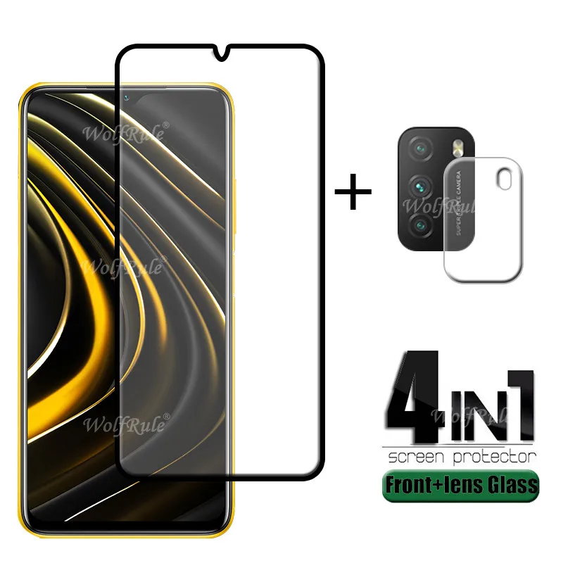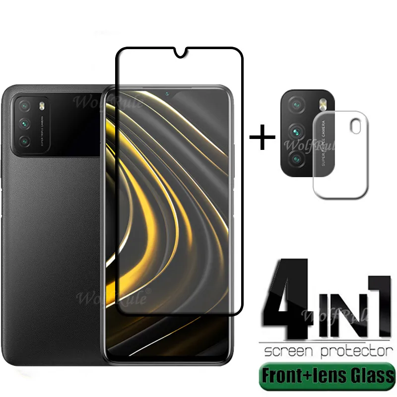 Comprar Protector de pantalla de vidrio 4 en 1 para Xiaomi Poco M3, cubierta completa de vidrio templado, película de pegamento HD para Poco X3 M3