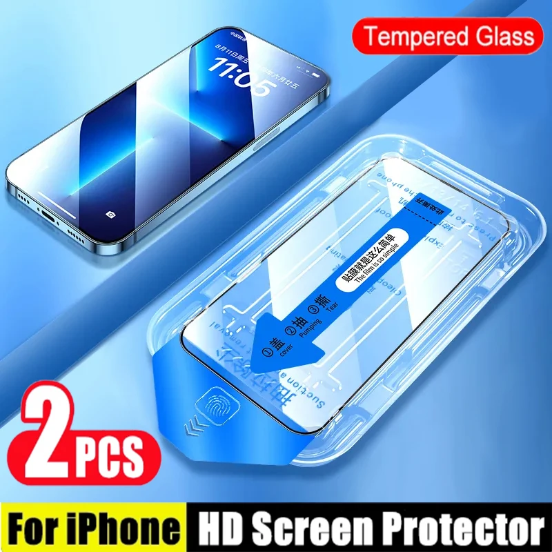 Protector de pantalla de vidrio templado para iPhone 15 13 14 12 11 Pro Max, iPhone 15 14 Pro Plus, Kit de instalación automática de eliminación de polvo, 2 uds.
