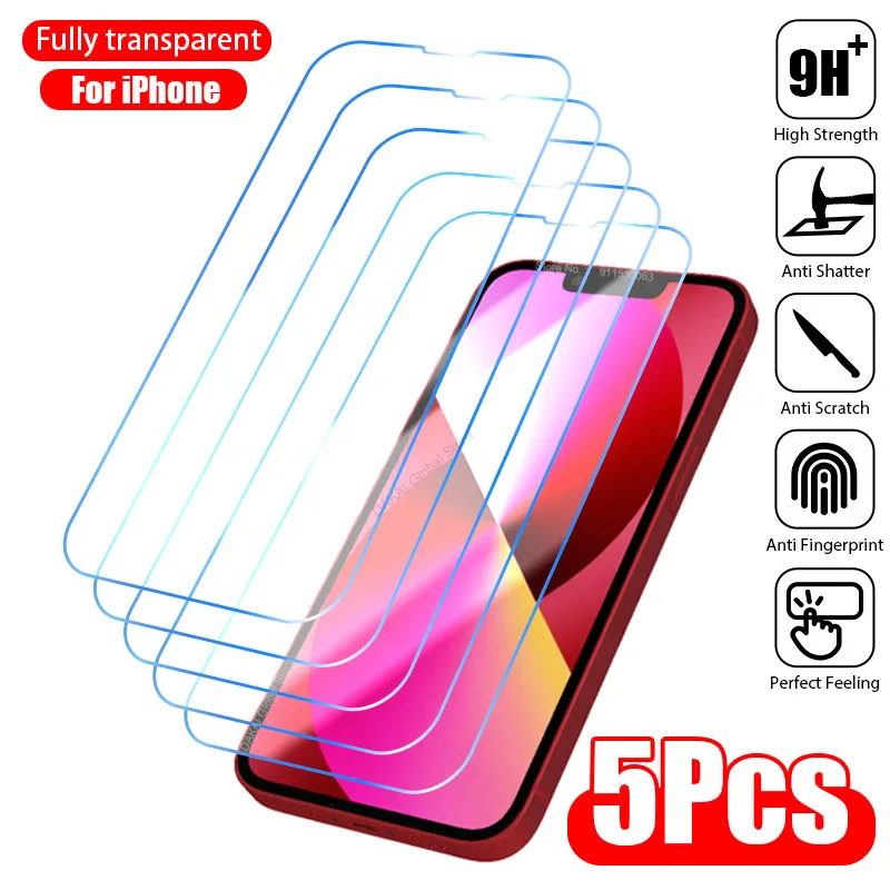 Comprar Protector de pantalla de vidrio templado para iPhone, 15, 14, 13, 12, 11 Pro Max, SE 2020, 2022, XR, X, XS Max, 13, 12 Mini, 14, 15, 7, 8, 6, 6s Plus, 5 unidades