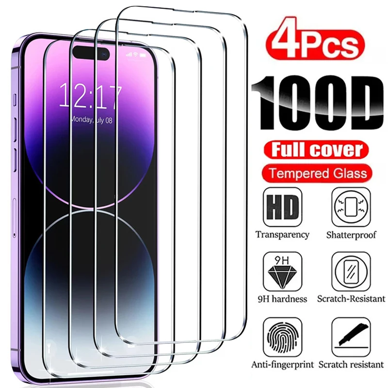 Protector de pantalla de vidrio templado para iPhone, Protector de pantalla para iPhone 15, 14, 13, 12, 11 Pro Max Mini, 7, 8, 6s, 14 Plus, SE2020, X, XR, Xs, Max, 4 unidades