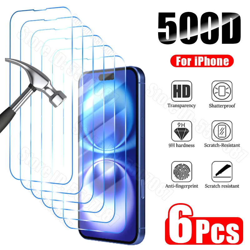 Protector de pantalla de vidrio templado para móvil, Protector de pantalla para iPhone 16, 15, 14, 13, 12, 11 Pro Max, 16, 15, 14 Plus, X, XR, XS Max, SE 2020, 2022, 6 unidades