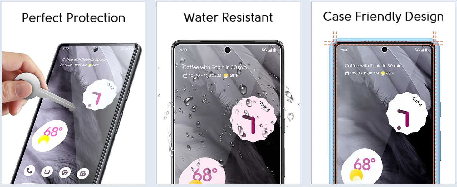 Pixel 6a: El ajuste no es perfecto. No se extiende hasta el borde. Si ajustas el orificio para la cámara, el borde del protector hará que la parte superior de la pantalla no sea visible...
