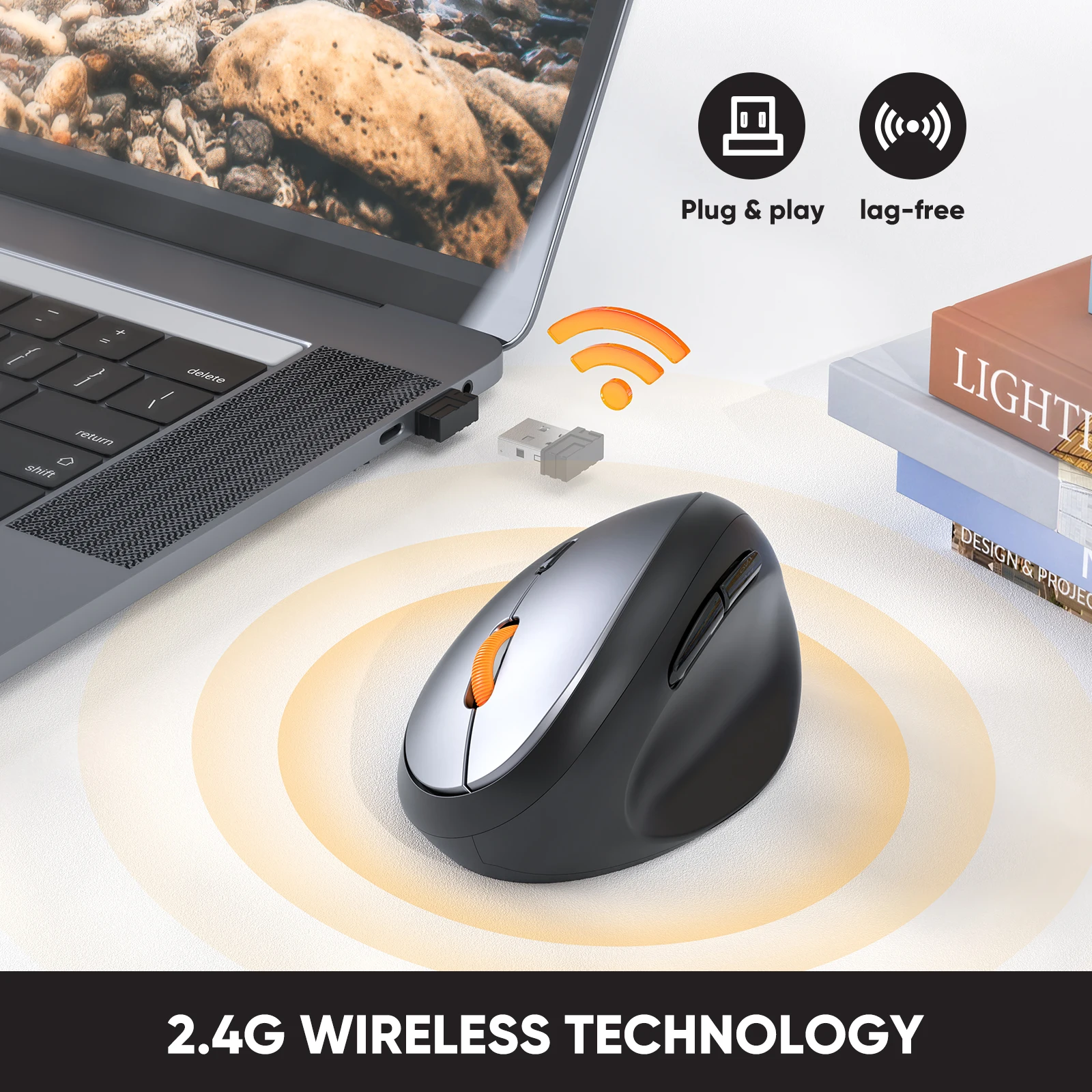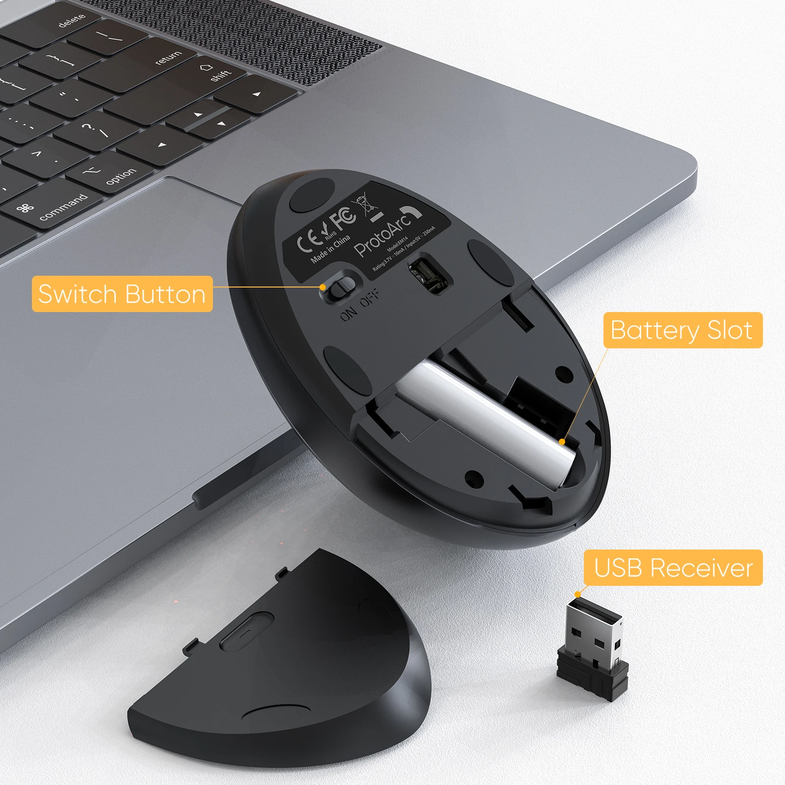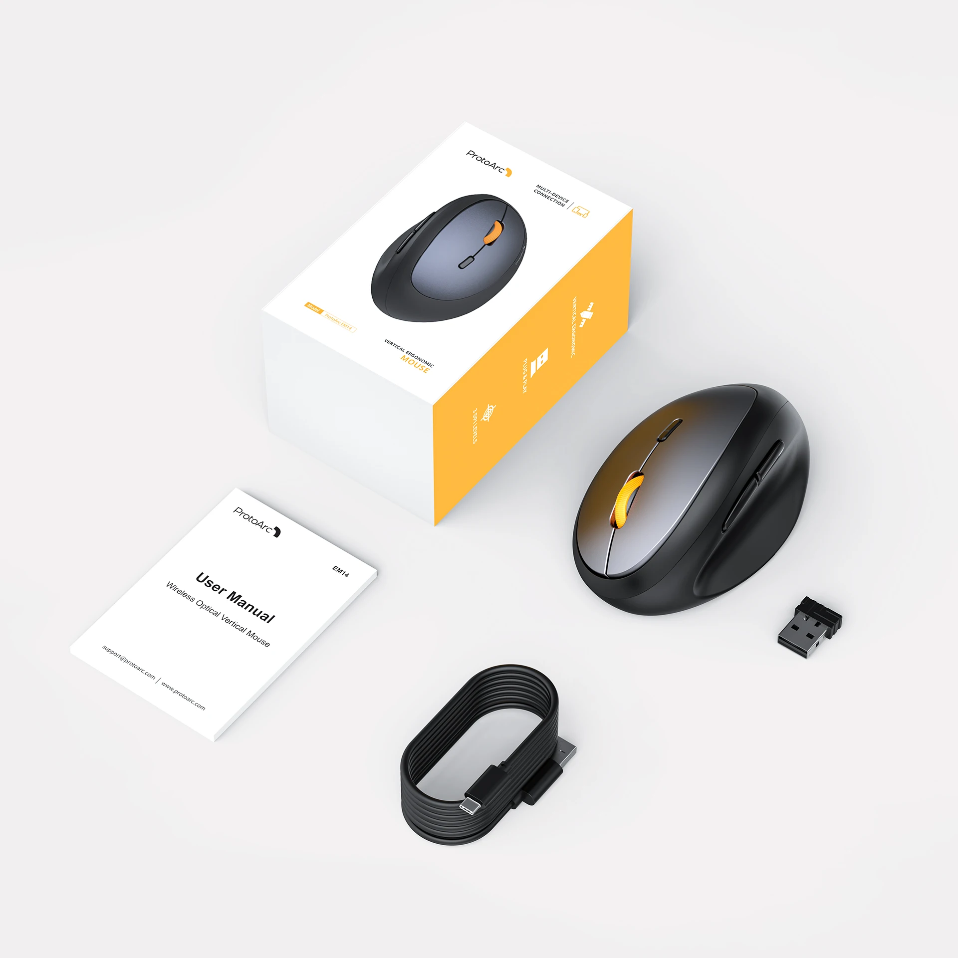 One Wireless Vertical Ergonomic Optical Mouse, one 2.4G USB receiver ( In the Bottom of the Mouse, Plug & Play) and 12 month warranty.