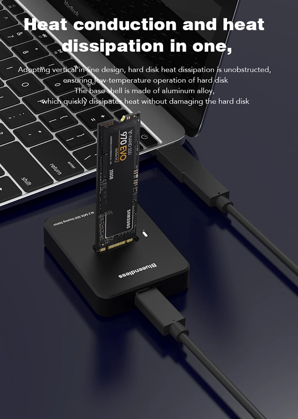 Adopte un diseño en línea vertical, la disipación de calor del disco duro no tiene obstáculos, lo que garantiza el funcionamiento a baja temperatura del disco duro. La carcasa de la base está hecha de aleación de aluminio, que disipa rápidamente el calor sin dañar el disco duro.