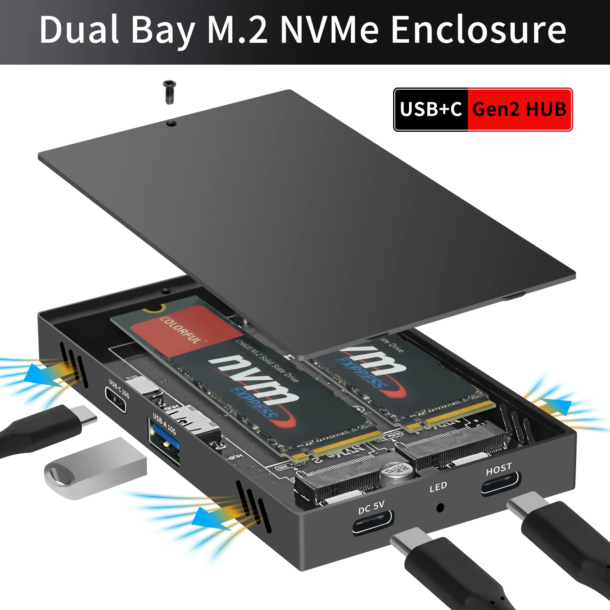 Comprar Protocolo Dual M.2 NVME SSD Case M.2 Dual Bay NVMe Enclouse estación de acoplamiento hub usb3.2 gen2 10Gpcs unidad de estado sólido adaptador HDD