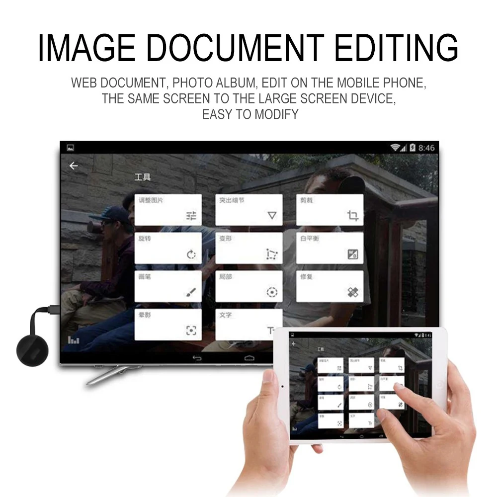 Easy to operate. No application or software driver is required. Only by 3 steps can you easily enjoy music, video, photo, office file and website on large screen: Plug- Connect- Mirror. Plug it into TV's hdmi-compatible-compatible interface and use 5V/1A power supply, then connect the device by Miracast, Airplay or DLNA mode with instructions, finally mirror the media on the big screen.
