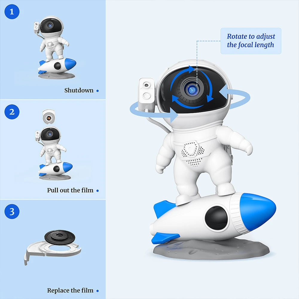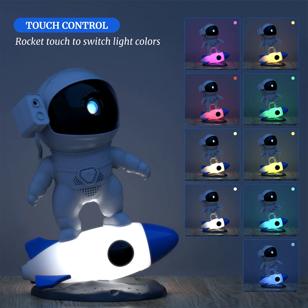 Nuestro proyector de galaxias estrella astronauta tiene una luz nocturna en forma de cohete con 9 colores, que se pueden cambiar presionando el botón en la cabeza del cohete. Además, la cabeza del astronauta está conectada magnéticamente al cuerpo y se puede girar 360 ° para ajustar el ángulo de proyección de la nebulosa. Sus brazos también pueden posar en varias poses, lo que lo convierte no solo en un proyector de estrellas galácticas, sino también en una gran decoración.
