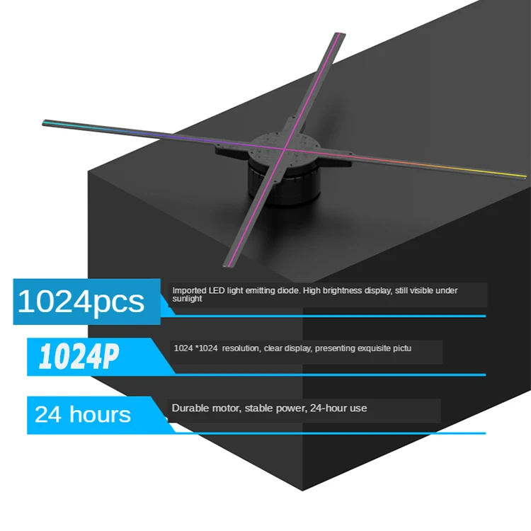 Tamaño del brazo del ventilador 75cm Sistema operativo Android Cuatro núcleos 1,5 G, almacenamiento de 16 GB Modo de control WIFI 2.4G, gestión de teléfonos móviles Resolución 1024*1024 Brillo Visible al aire de 1900 cd/m2 Frecuencia de fotogramas 24 cuadros/seg. De por vida 30000 horas Soluciones punto a punto y control remoto de red; apelmazamiento, empalme Aplicación de Android admite encendido/apagado... etc. Certificado CE/FCC/RoHs/ISO9001/ISO14001 Palabras clave del producto holograma, ventilador LED 3D, holograma de ventilador LED 3DSistema operativo Android 7.1, procesador ARM de cuatro núcleos 1,5 G, almacenamiento de 16 GB.
