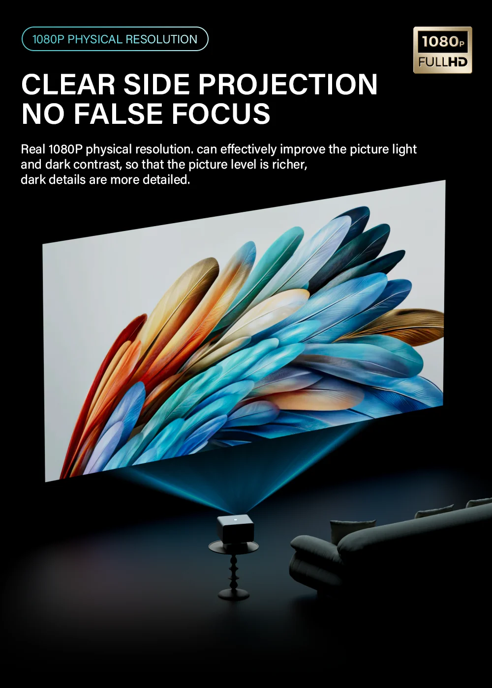 Resolución física real de 1080P.Puede mejorar eficazmente el contraste de la luz y la oscuridad de la imagen, de modo que el nivel de la imagen sea más rico y los detalles oscuros sean más detallados.