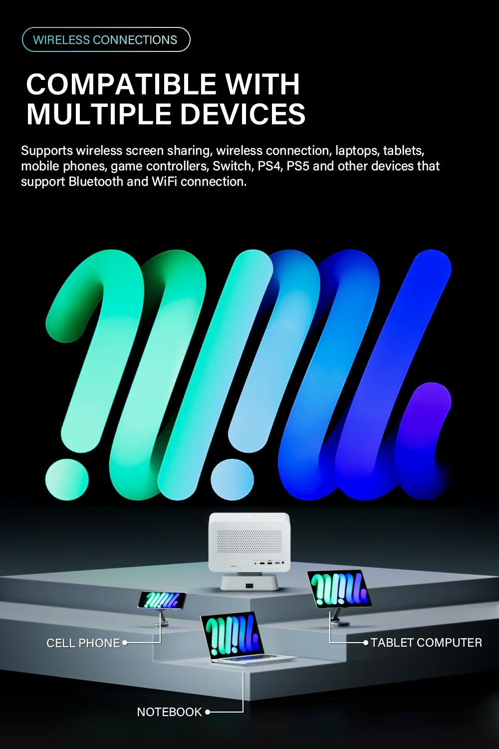 Admite compartir pantalla inalámbrica, conexión inalámbrica, computadoras portátiles, tabletas, teléfonos móviles, controladores de juegos, Switch, PS4, PS5 y otros dispositivos que admitan conexión Bluetooth y WiFi.